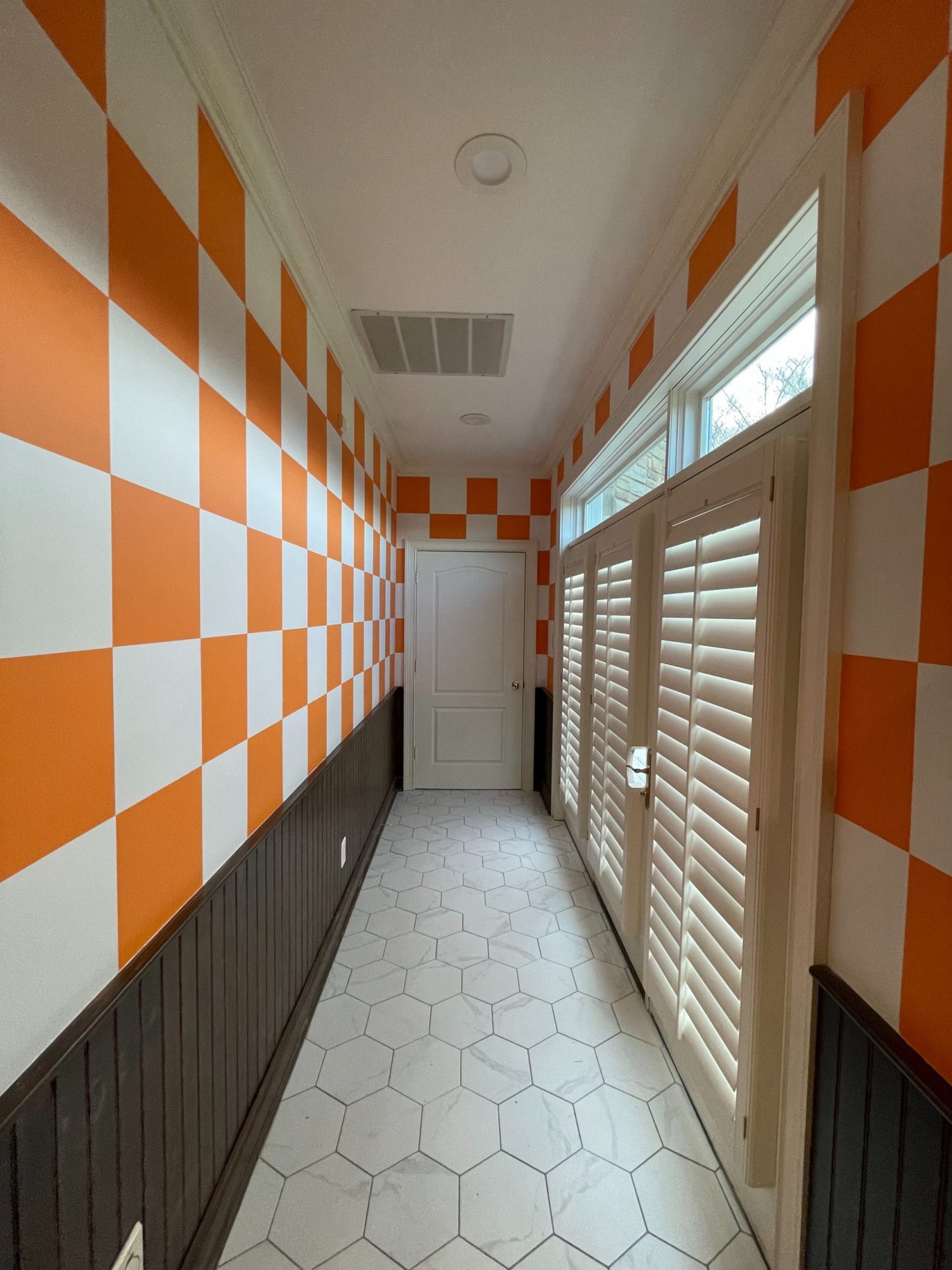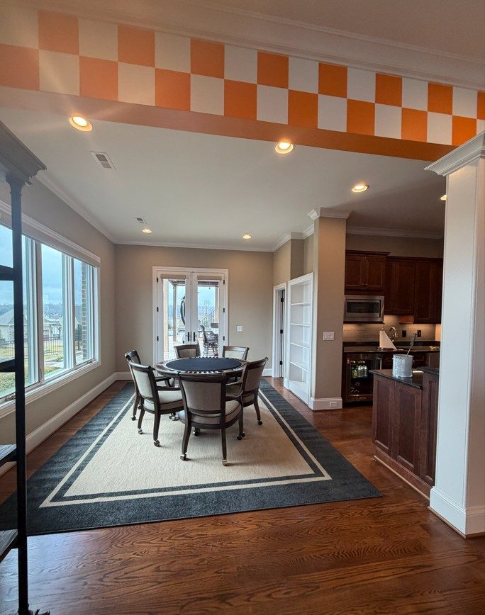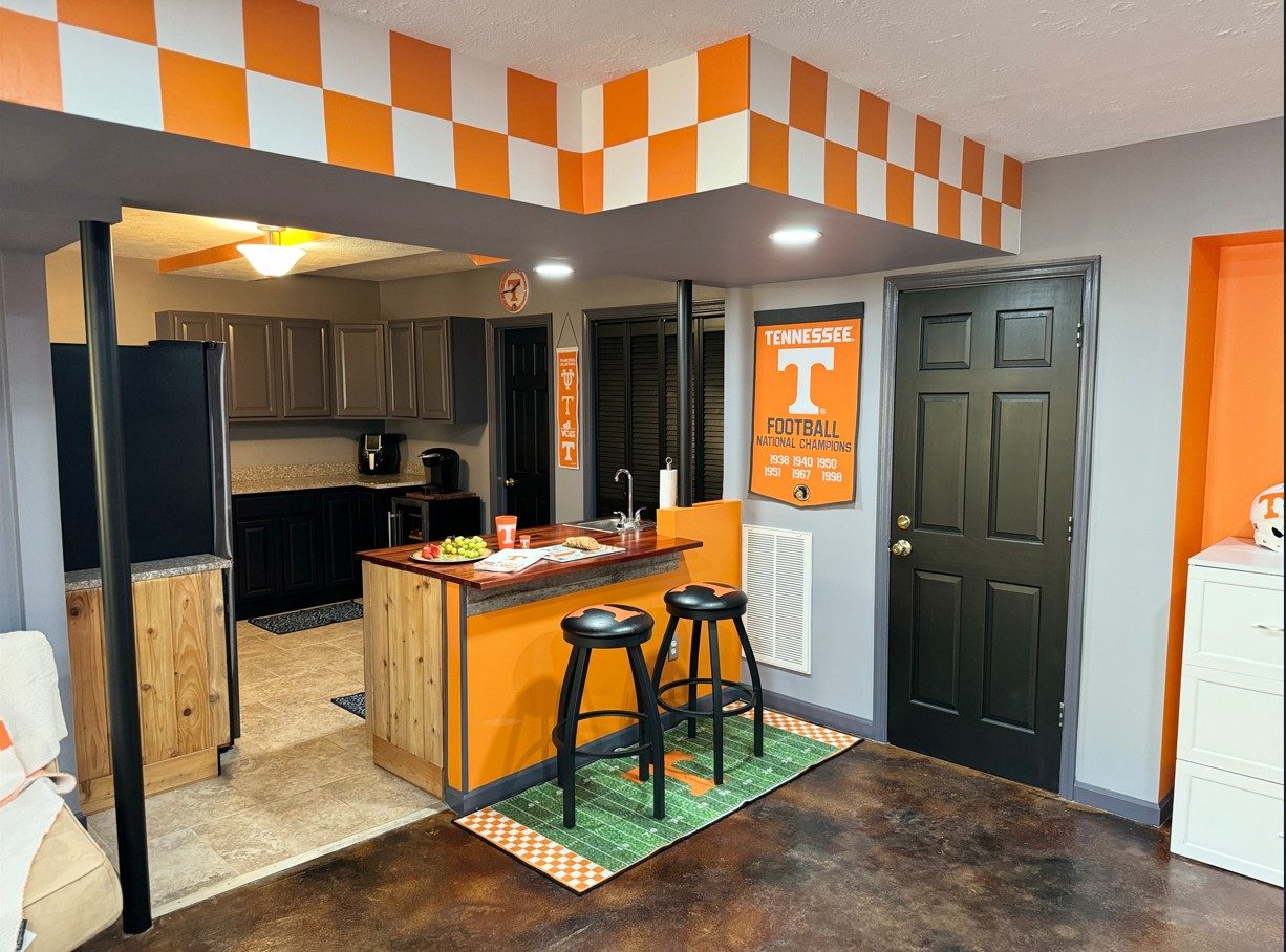 We partnered with Alumni Hall and the Vol Network to sponsor a “Mancave Makeover” contest, transforming the winner’s basement into the ultimate Tennessee “Vol for Life” space. From the signature orange-and-white checkerboard frieze to bold orange accents on the walls and bar, every detail was designed to showcase the winner’s passion for Tennessee Athletics.