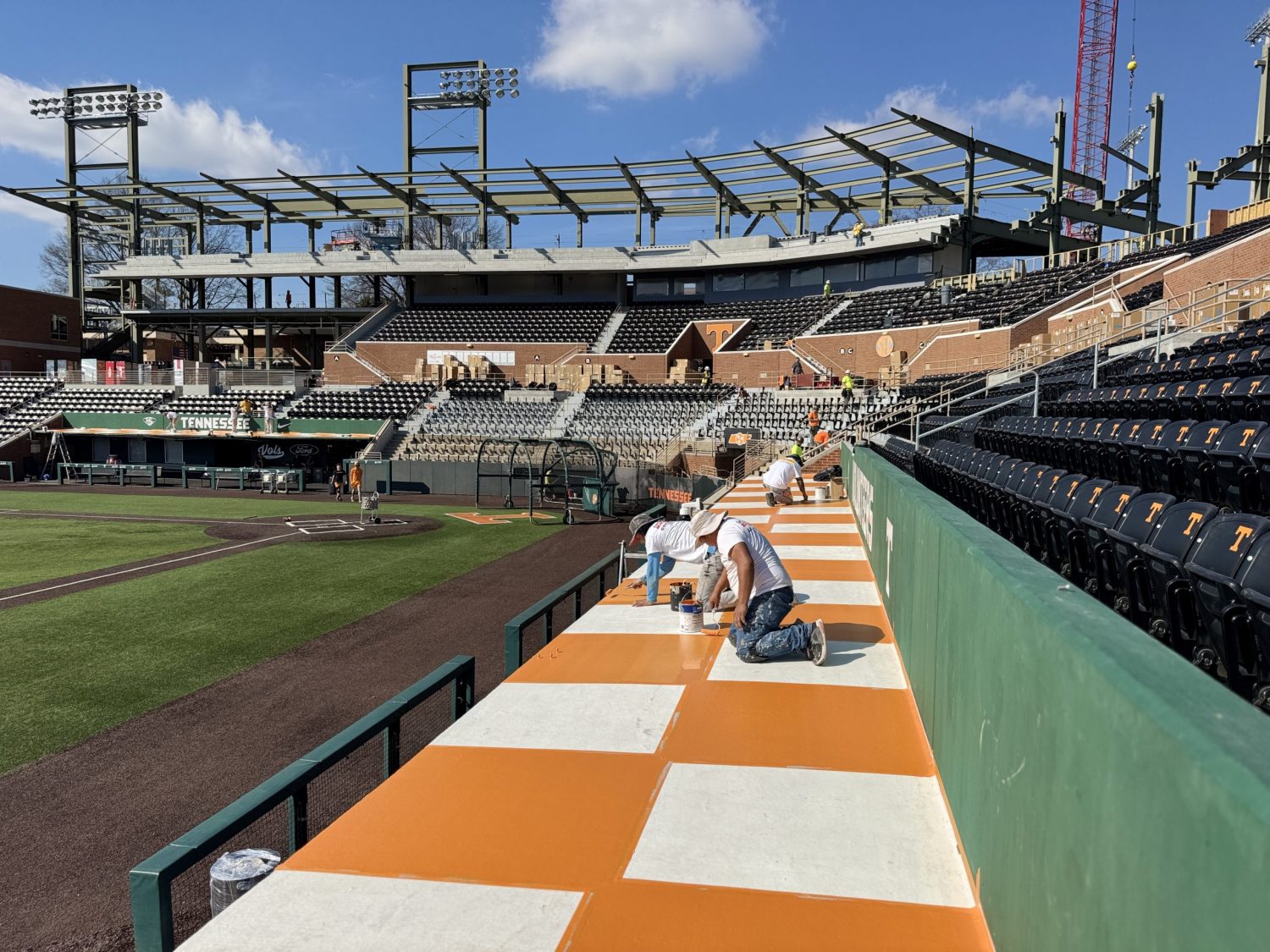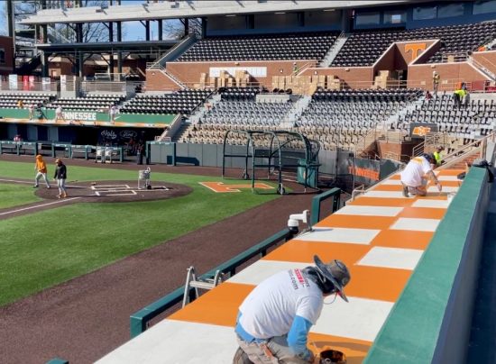 In 2025, our team painted the dugouts at Lindsey Nelson Stadium, featuring a fresh orange-and-white checkerboard design. The project also included handrails, batting cages, and various stadium sections.