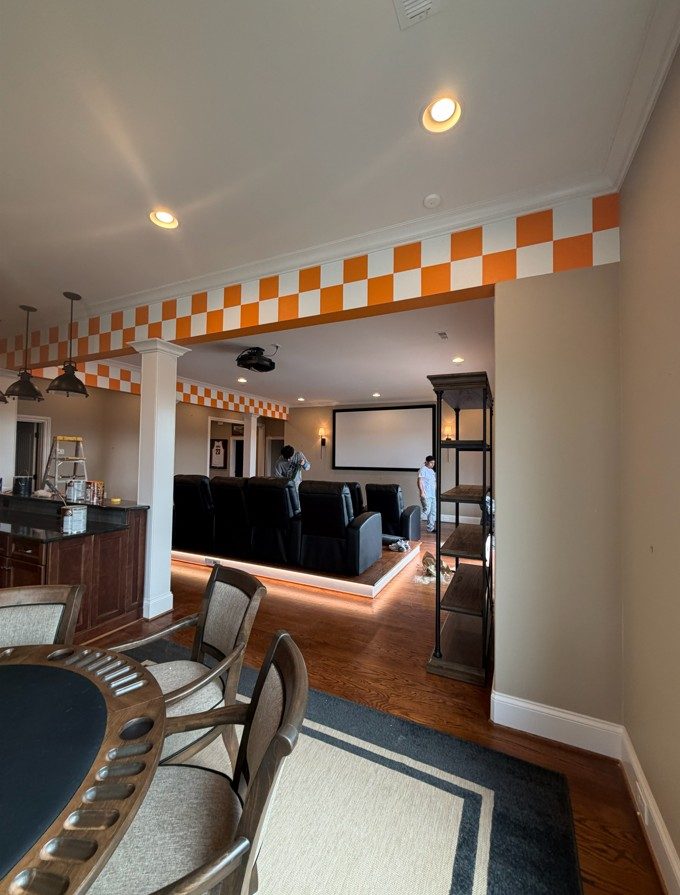 We recently completed a custom Tennessee Volunteers checkerboard frieze and wall header in a finished basement featuring a bar, game room, and home theater.