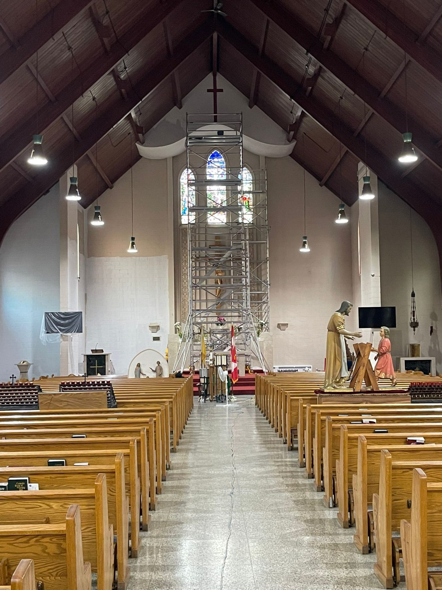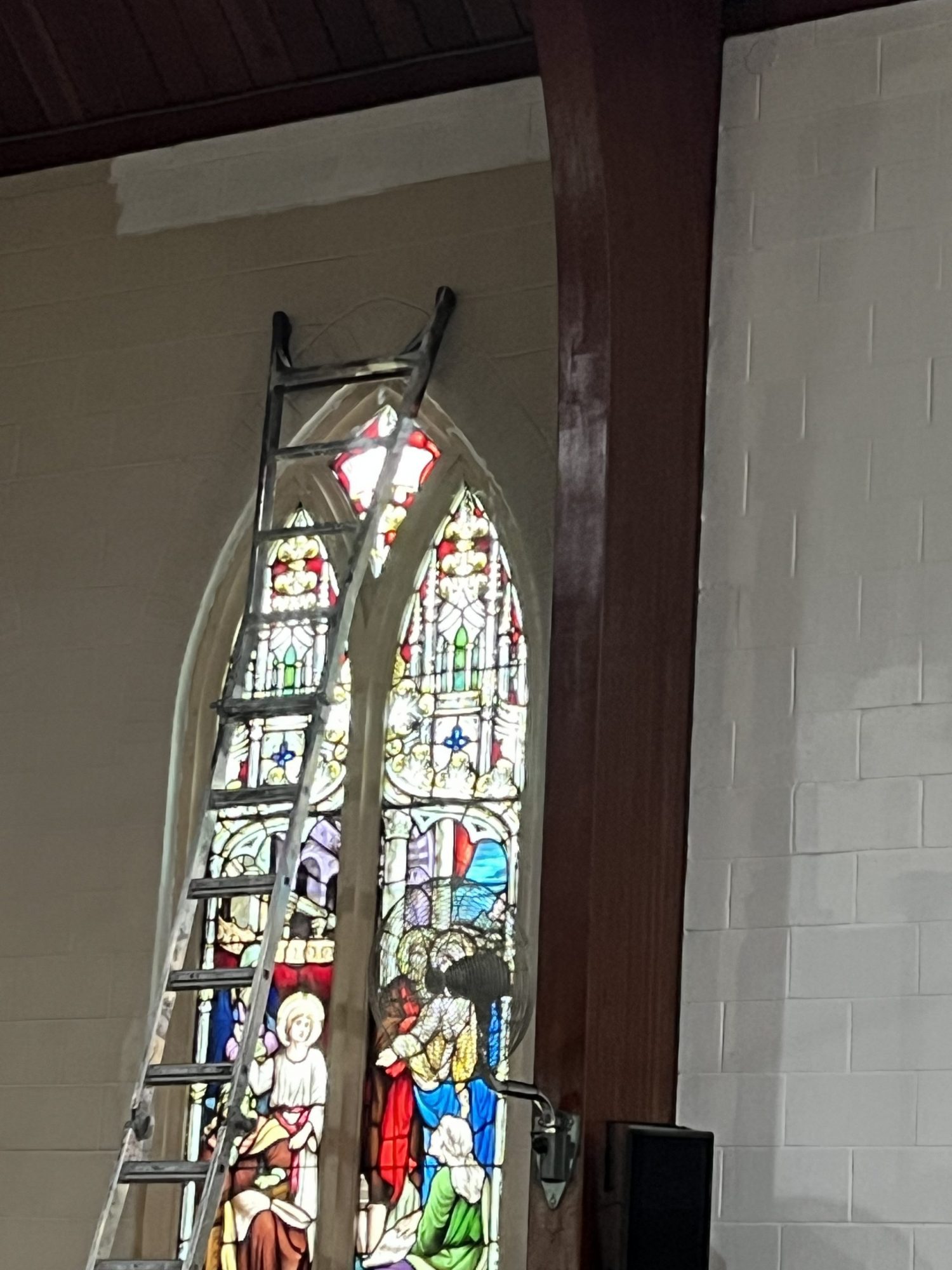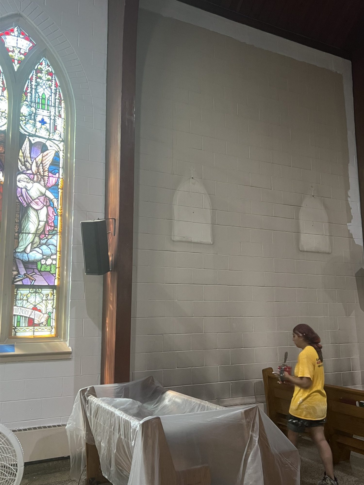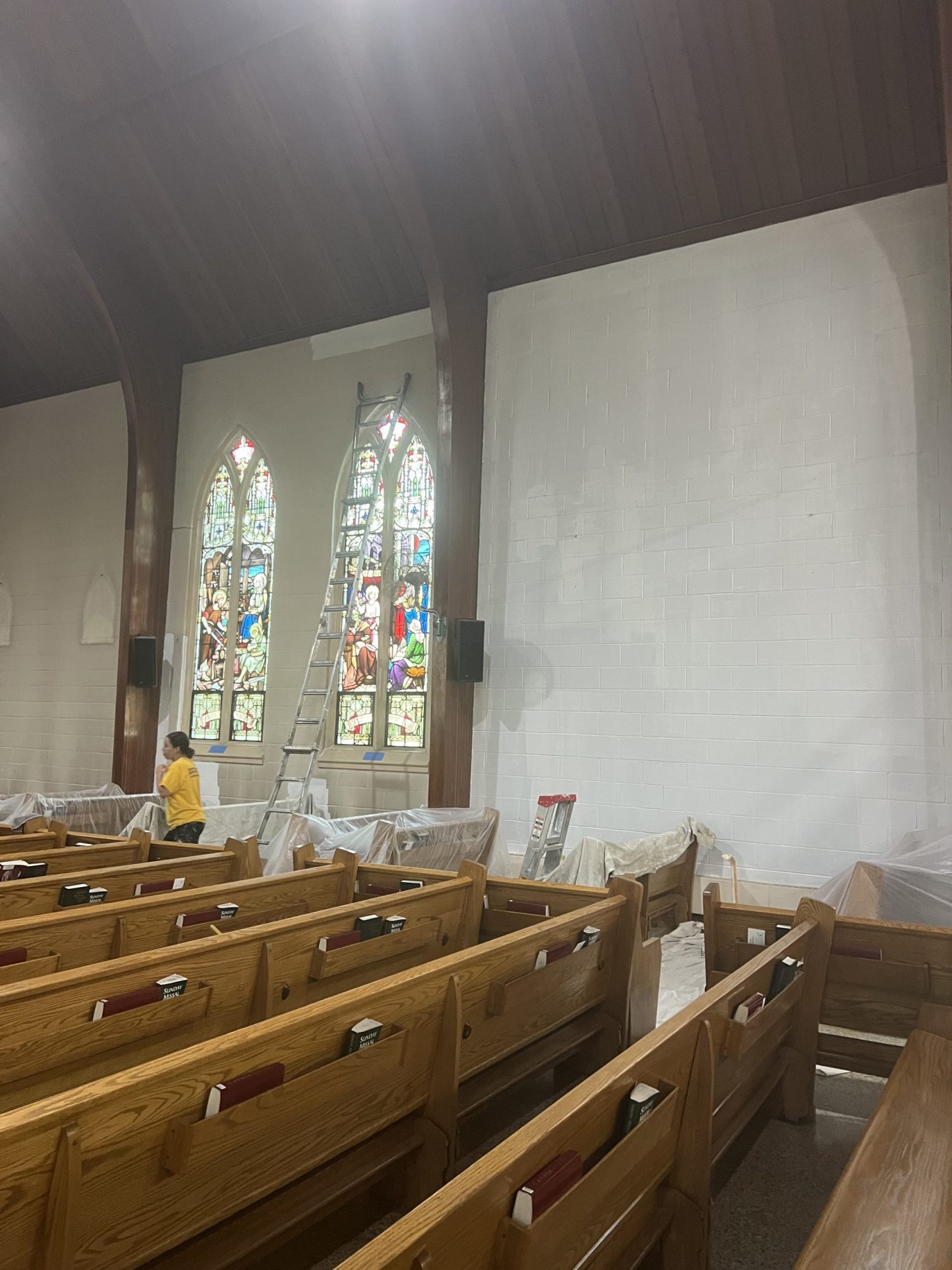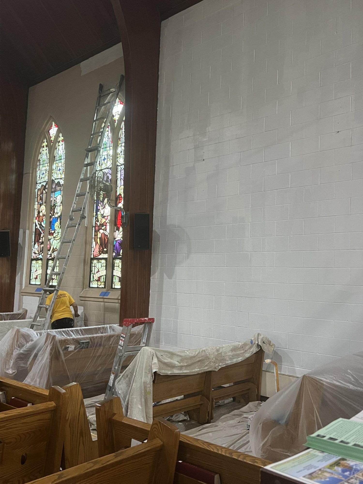 Accessing high areas and the altar required the use of two scaffolding systems, while painting around stained glass demanded careful material selection and extra attention to detail. Several pews were temporarily removed to access tight spaces behind the radiators and along the lower walls.