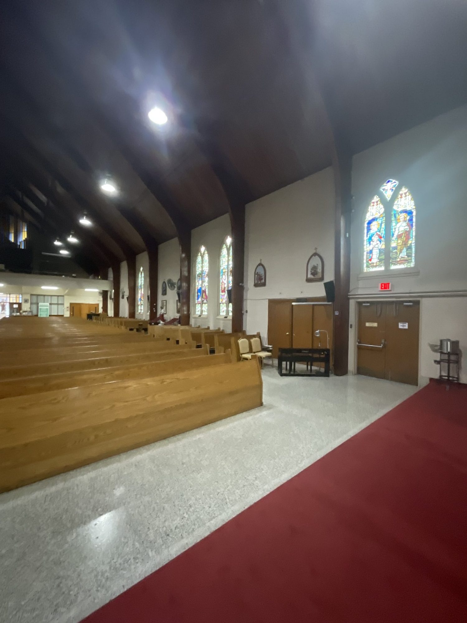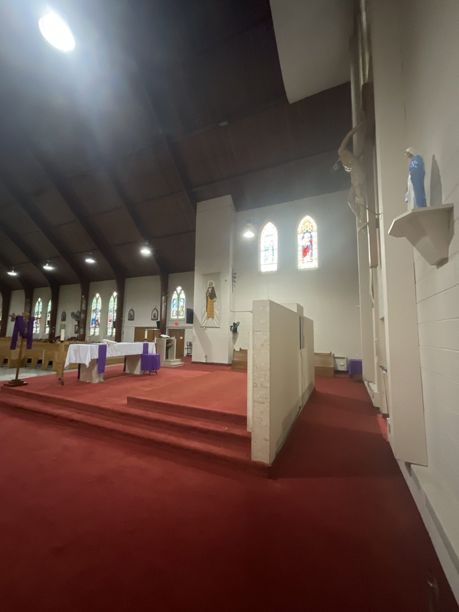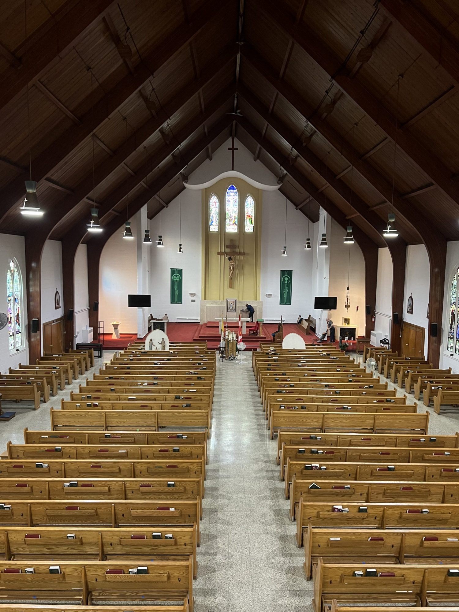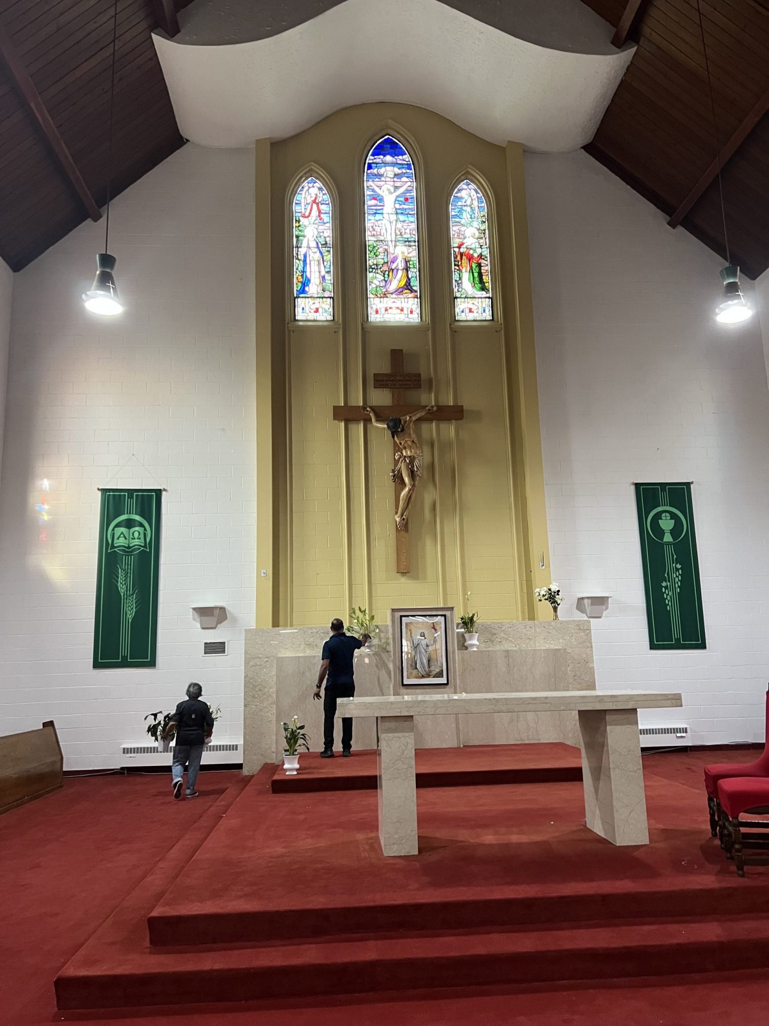 Accessing high areas and the altar required the use of two scaffolding systems, while painting around stained glass demanded careful material selection and extra attention to detail. Several pews were temporarily removed to access tight spaces behind the radiators and along the lower walls.