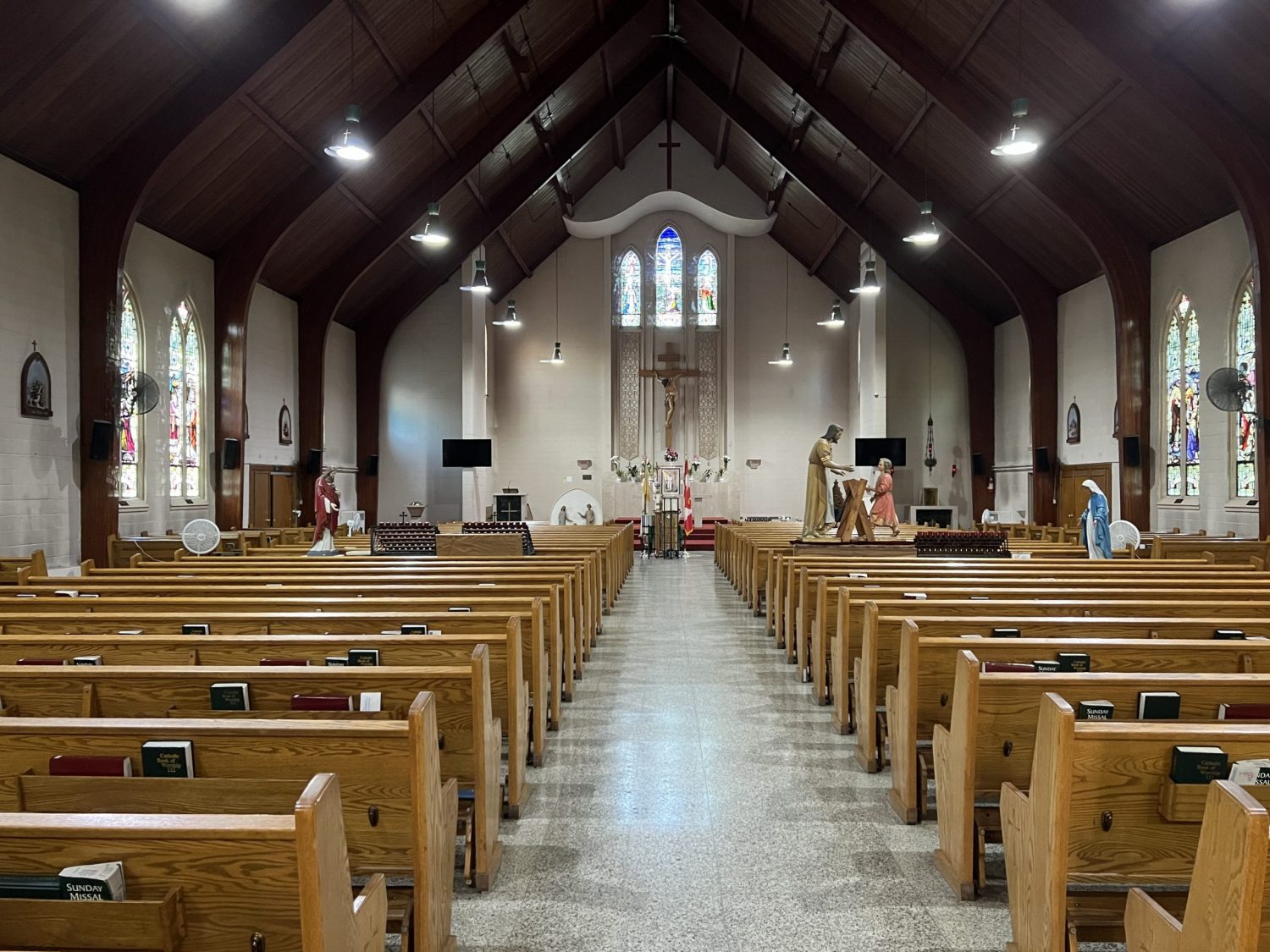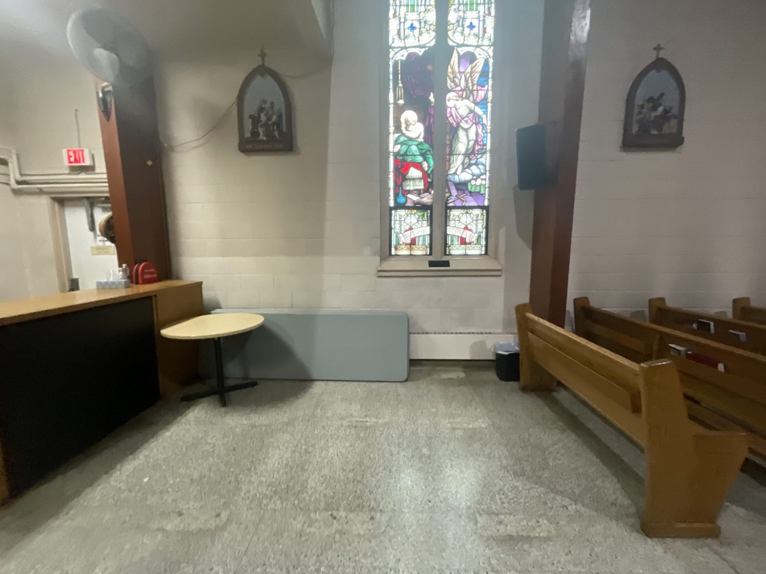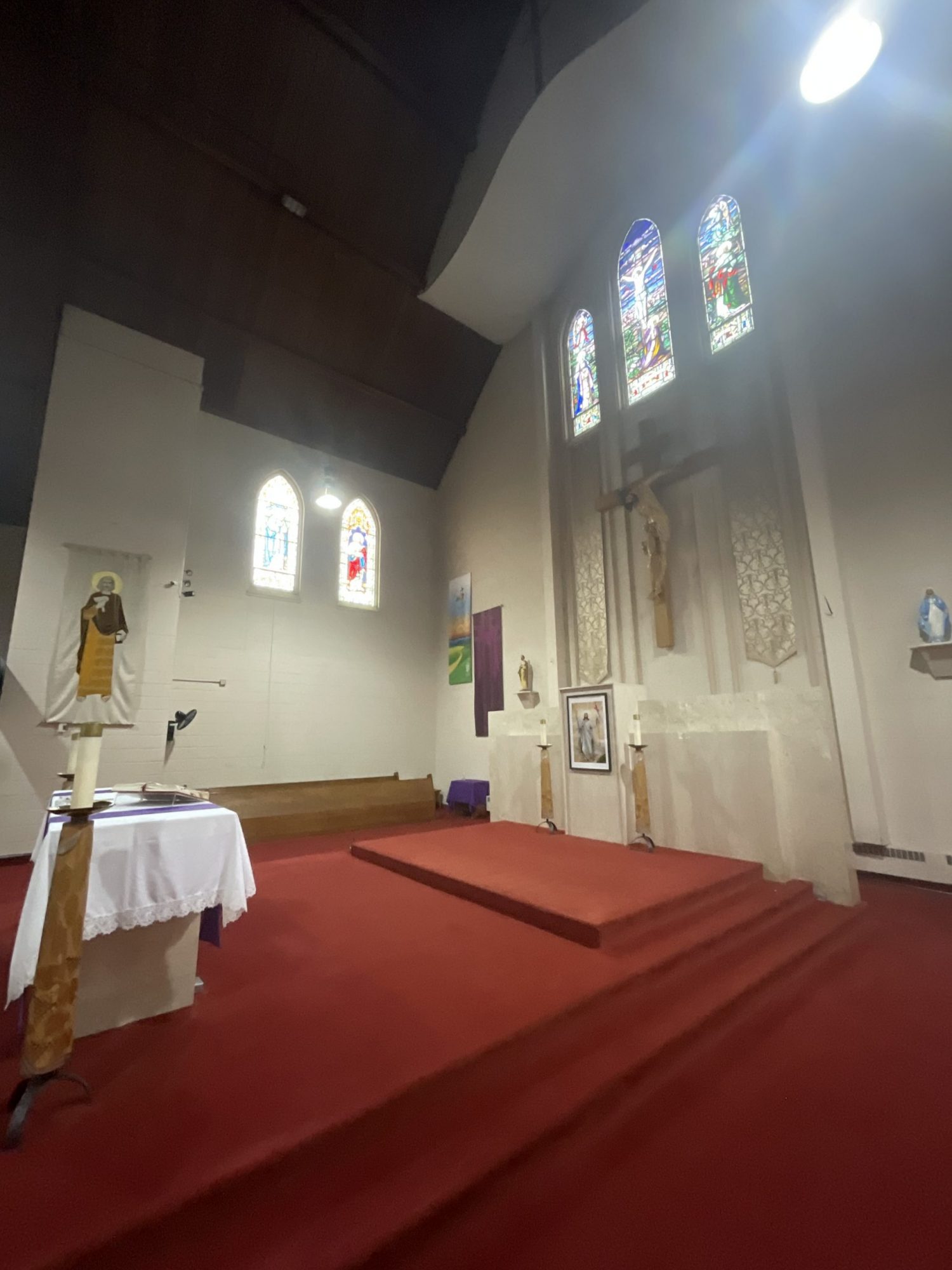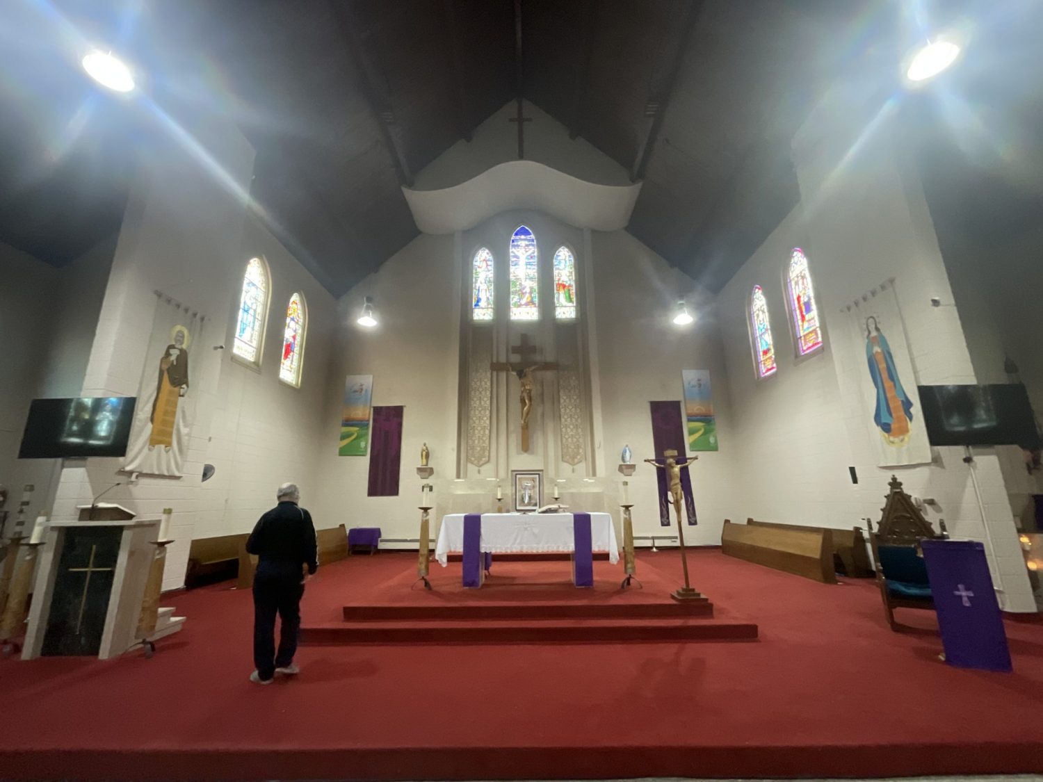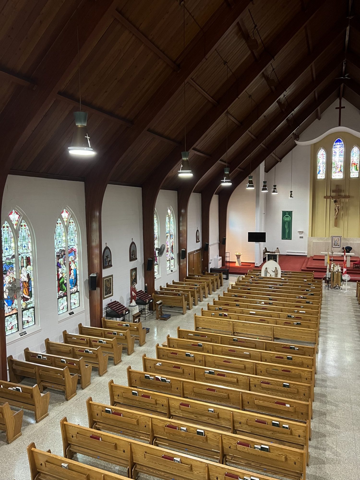 Accessing high areas and the altar required the use of two scaffolding systems, while painting around stained glass demanded careful material selection and extra attention to detail. Several pews were temporarily removed to access tight spaces behind the radiators and along the lower walls.