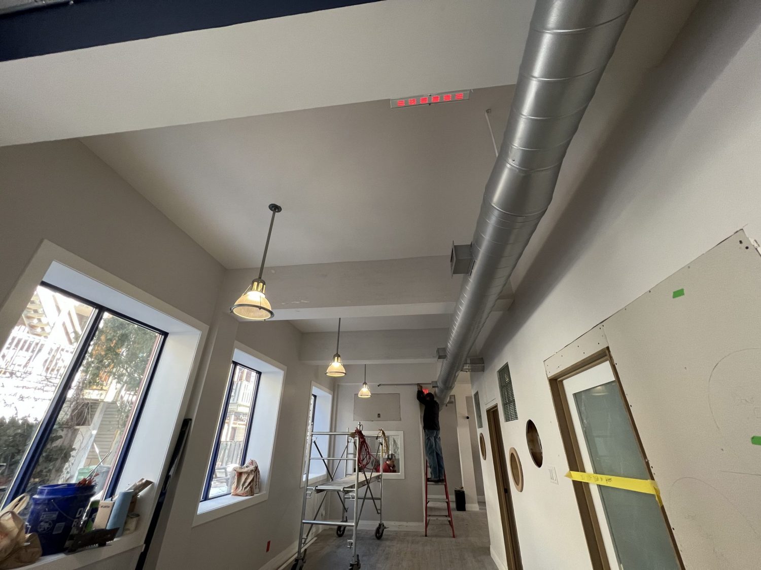The renovation required several steps, starting with patching and repairing any damaged drywall to ensure a smooth painting surface. We then proceeded with the careful application of vibrant new colors, chosen to inject energy and warmth into the café’s atmosphere. The painting of the air duct was a particular focus, as its prominence in the space meant that its appearance would significantly impact the overall aesthetic.