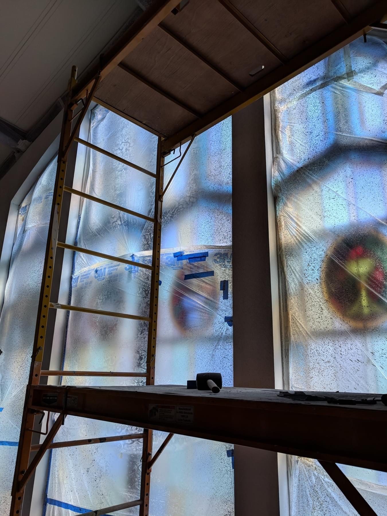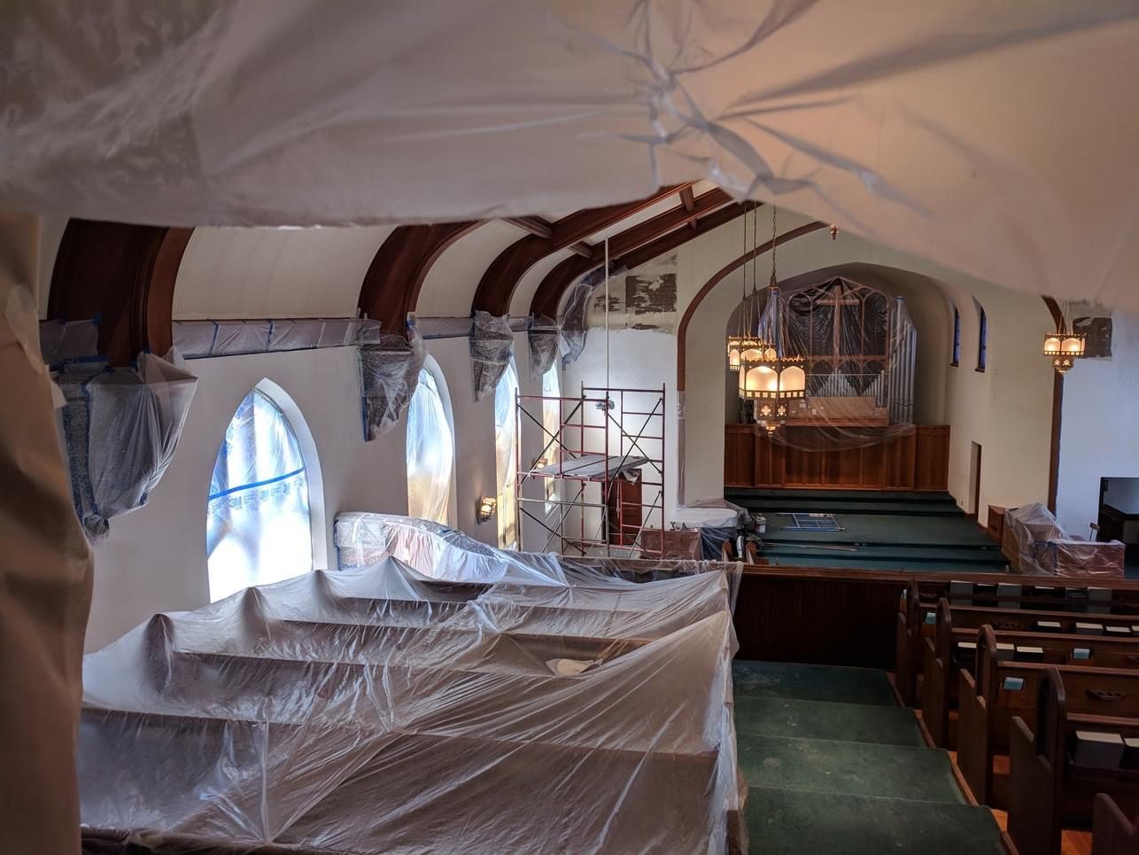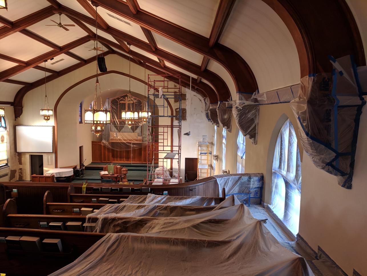 Church rehab project including wallpaper removal, wall repairs, new texture, and paint throughout.