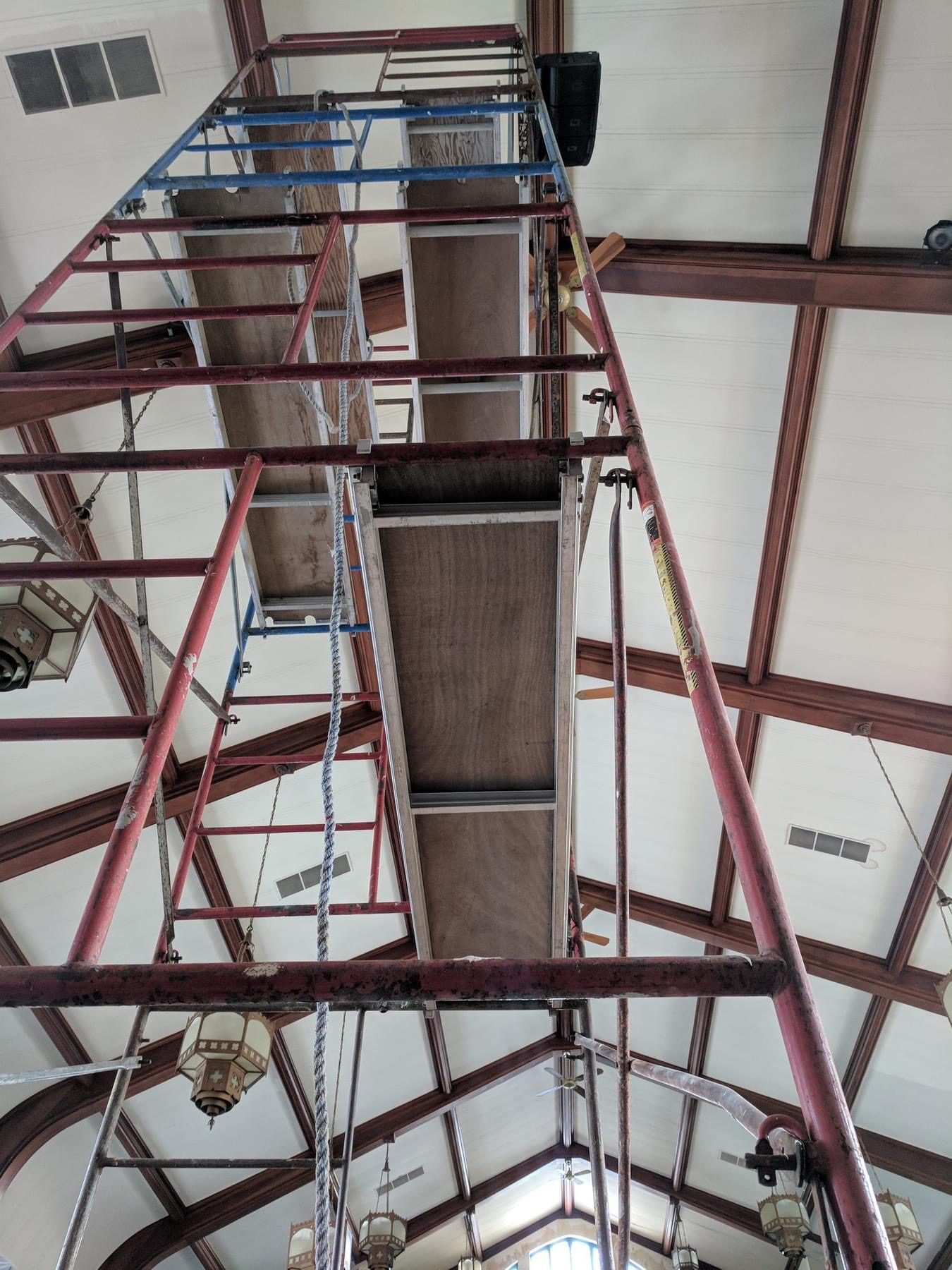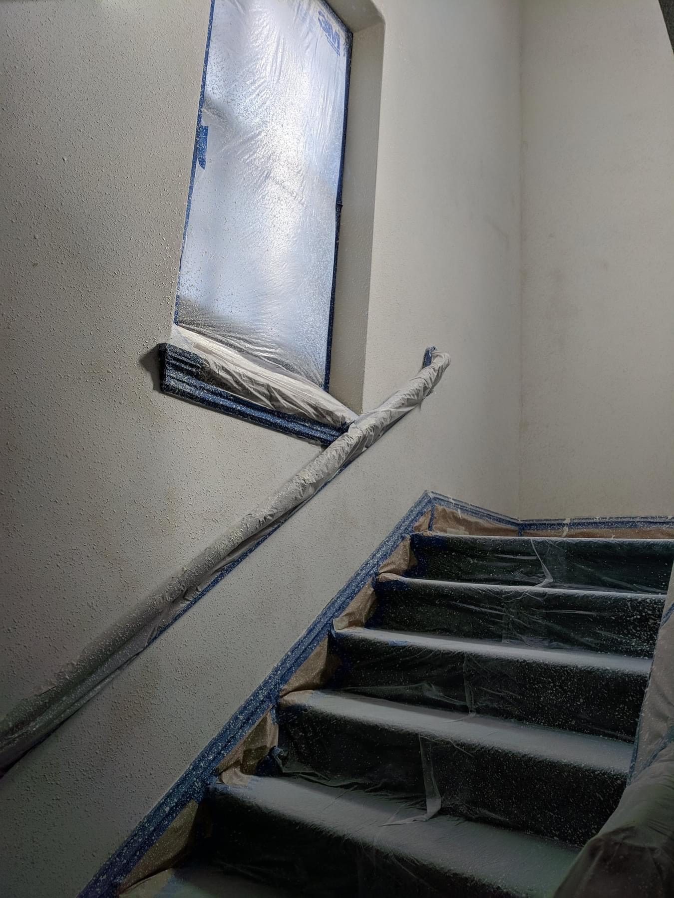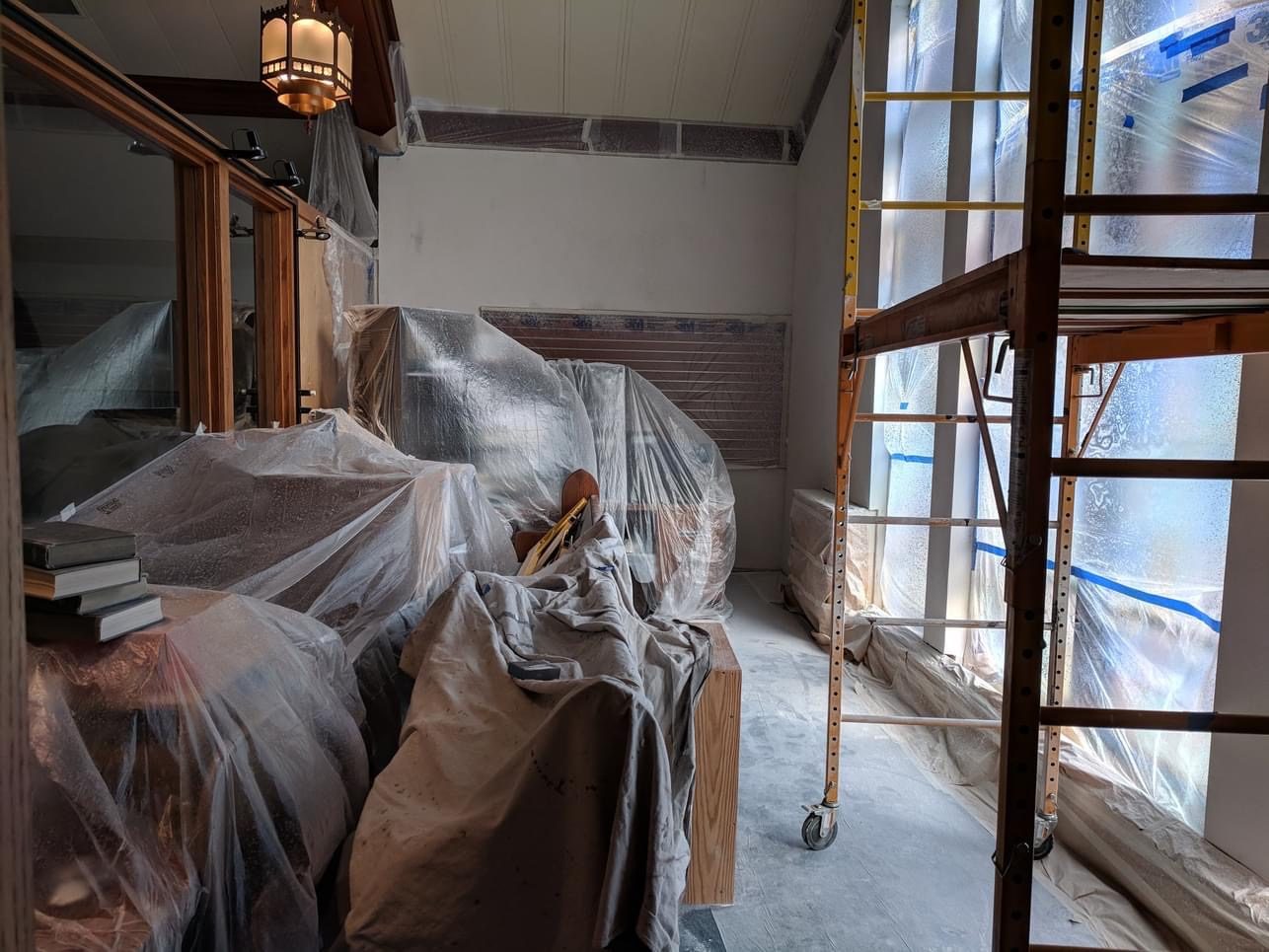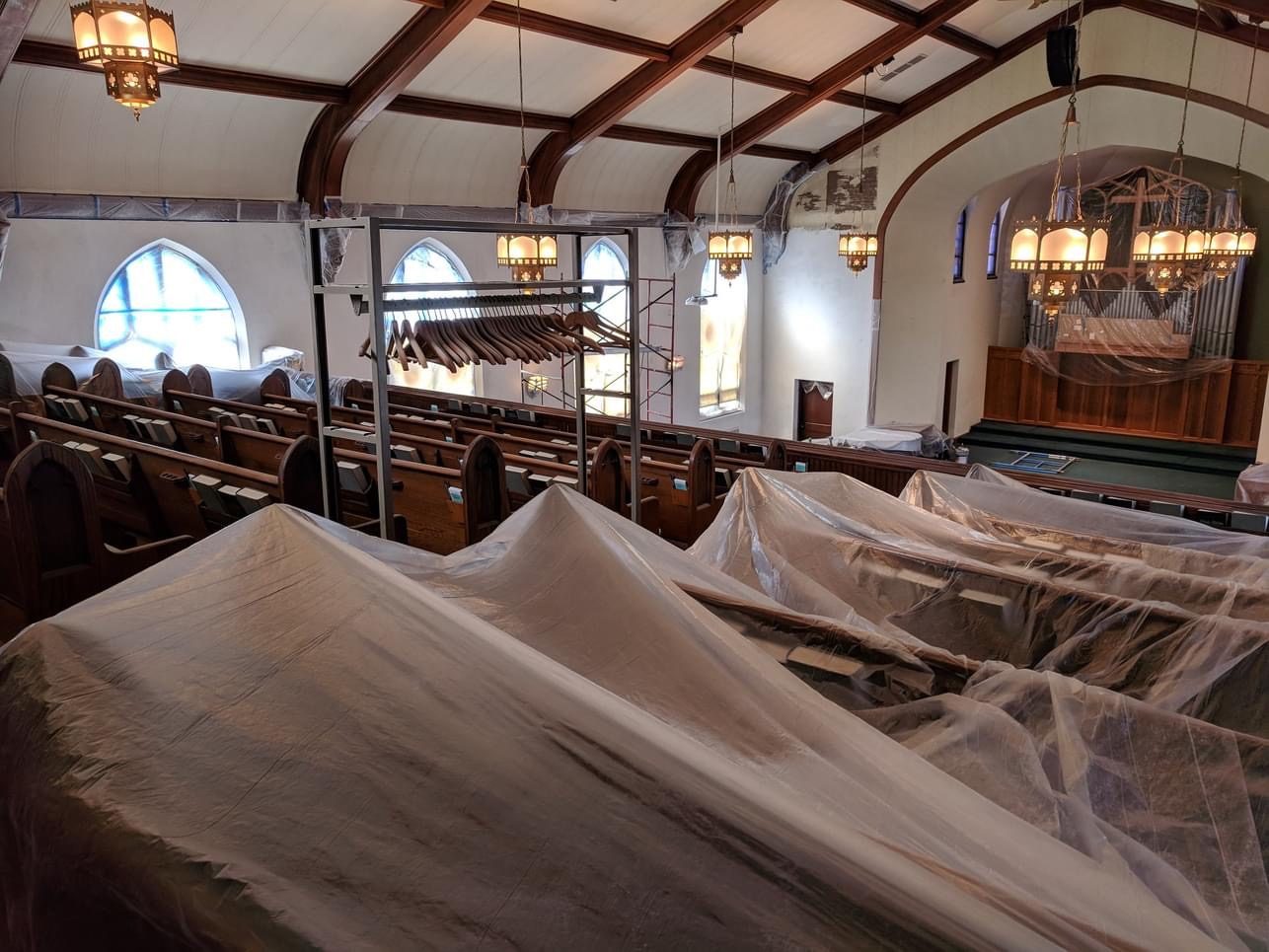 Church rehab project including wallpaper removal, wall repairs, new texture, and paint throughout.