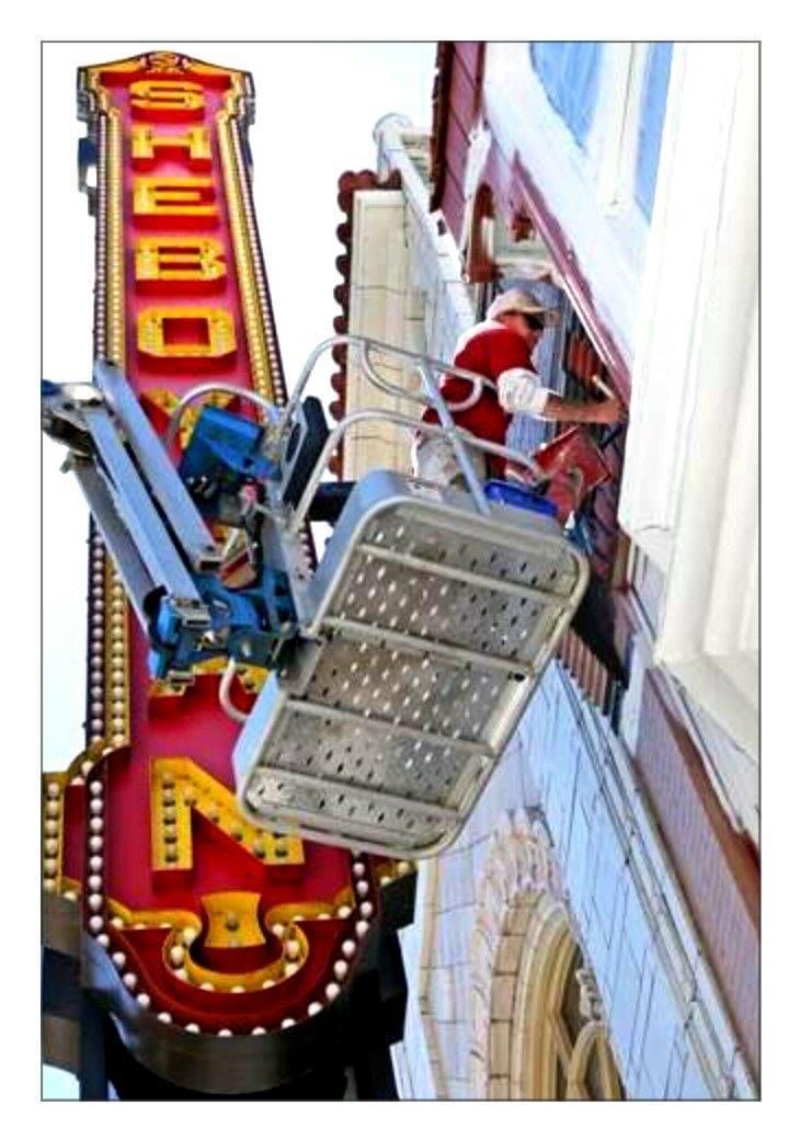 Here is a photo of one of our painters working hard repainting the exterior of this theater building in Sheboygan, WI.