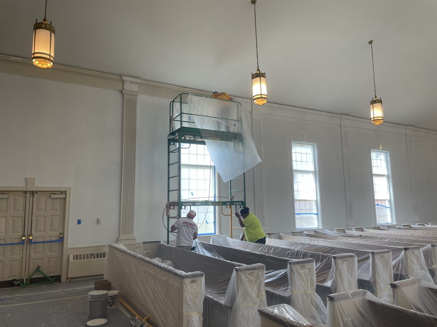 Our commercial painting team completed this interior church painting project here in Catonsville, MD. We began this project in April 2022 and it took 2.5 weeks to complete. This project was for a large sanctuary of a Methodist church. The area was about 3500 sq. feet with about 3000 feet of ceiling painting, 6000 feet of wall area. Also, about 50 pews as well as pulpits, kneelers, etc. were hand painted.
