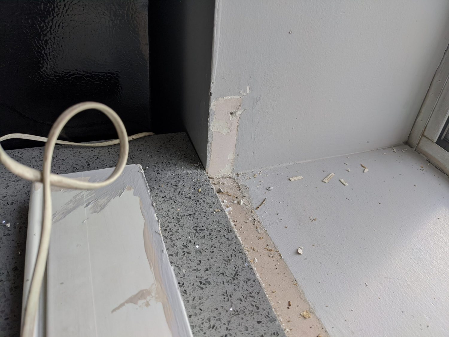 Initially intending to do the work internally, the staff had begun wall patching but then were pulled away by other priorities. In addition to completing the patching and removing a small counter divider, the walls were to be freshened with a similar shade of paint, and the baseboards repaired and repainted. Finally, the main entryway walls and staircase were not presenting the company in the best light, so the decision was made to include both in the scope of work.