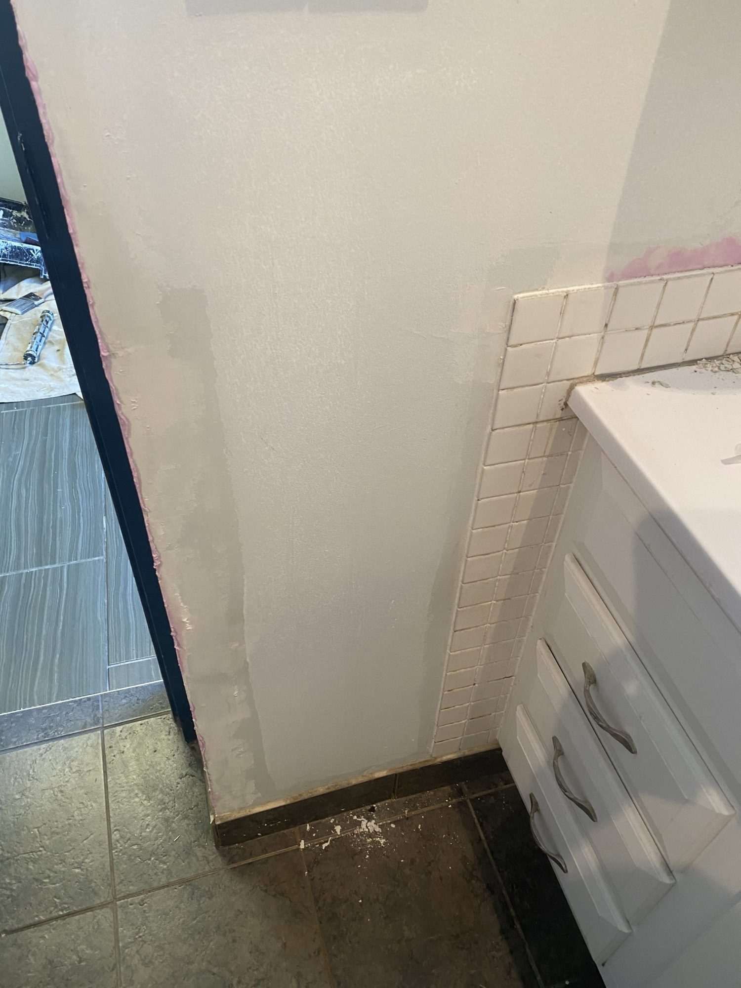 After preparing the surfaces with light degreasing and patching of minor imperfections, the walls in all areas were painted with Sherwin-Williams SuperPaint interior latex paint with a satin sheen.