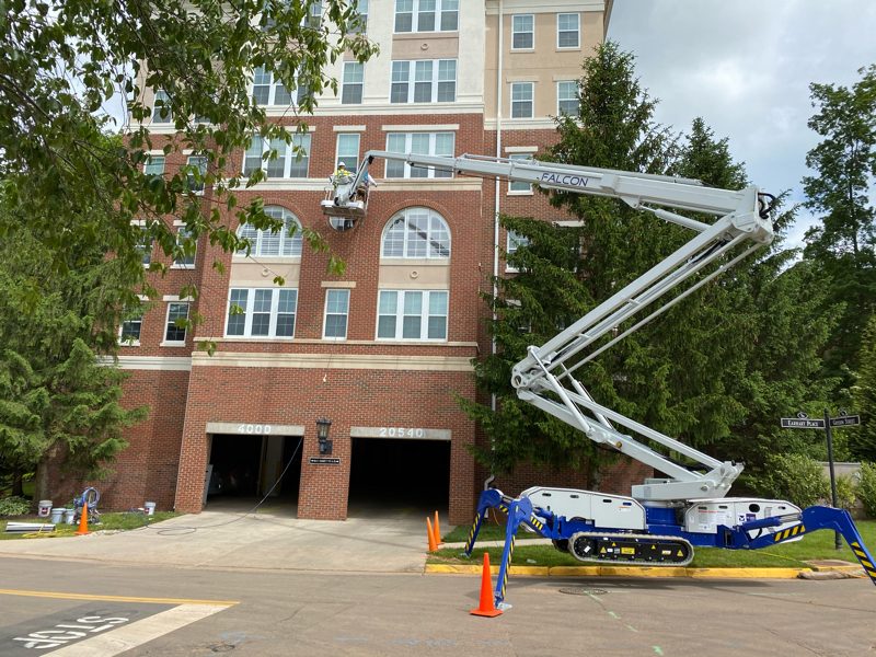This project had several special pieces of lift equipment that was needed to safely access all areas of the building, while minimizing damage to the surrounding landscaping due to the hilly terrain. We used 100′ atrium lifts to safely access all areas of the apartment buildings.