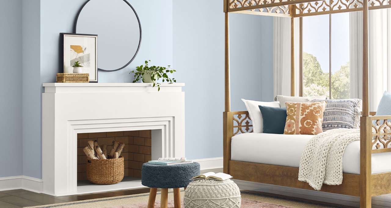 Your bedroom should be one of the most tranquil parts of your home. Upward is a light blue that can really bring a peaceful vibe to this space. It would pair well with a white trim. In terms of decor, you can keep your space neutral with muted tones like cream, gray, and tan. If your bedroom could use a refresh for 2024, this is a lovely color choice.