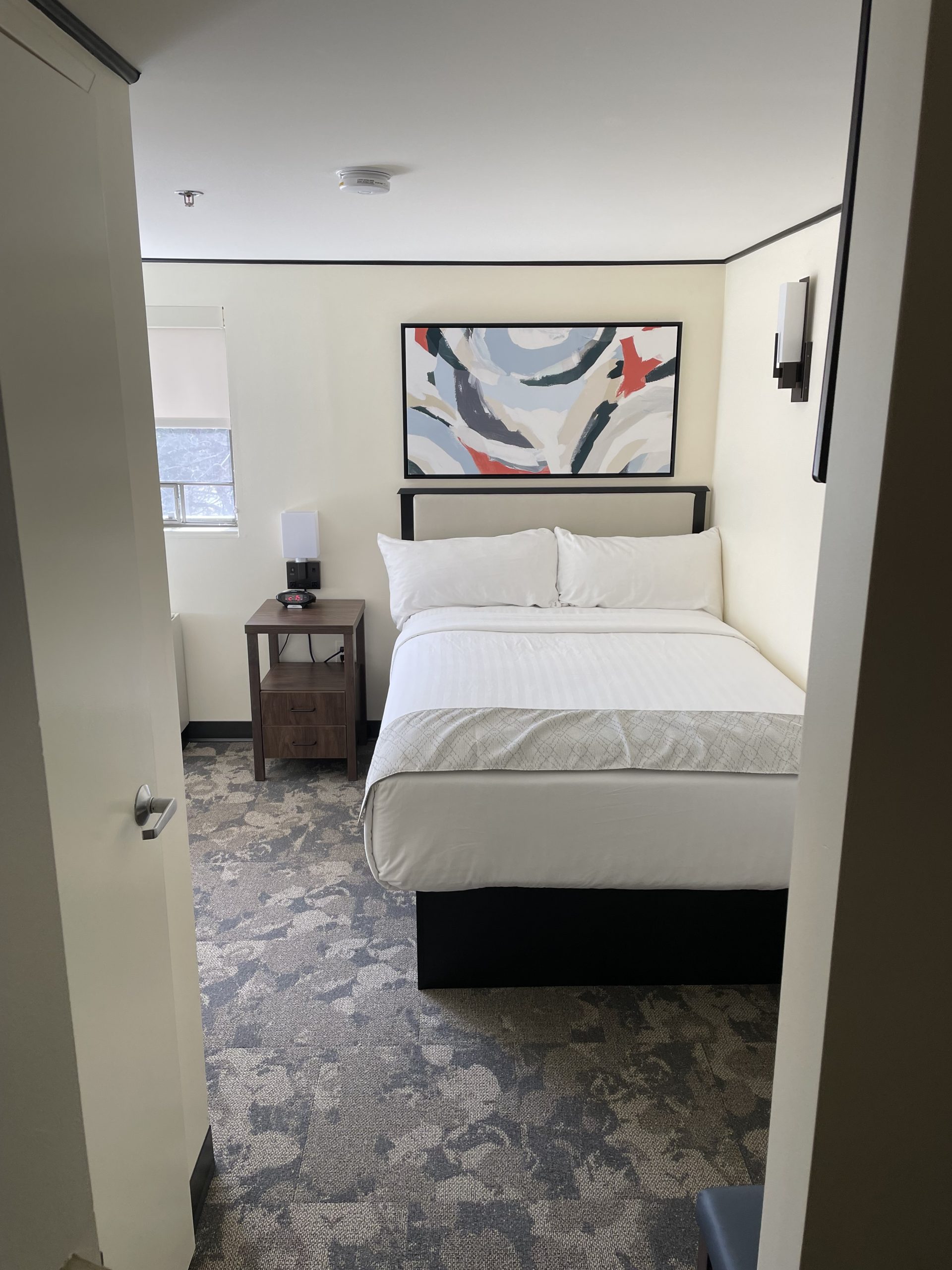 - Setup and Preparation – We paid attention to the details to ensure all surfaces were properly prepared (“paint-ready”) prior to paint application. This included performing skilled Level-3 Professional Preparation to all surrounding surfaces ie. addressing all nail pops/holes, damaged drywall (including wall scuffs), repairing cracks and tape seams, re-caulking open seams around trim, and spot priming bare surfaces/repair work so as to ensure a uniform finish of the top coat of paint.In addition, the project included removing cove molding (where carpet would be replaced) and installing, caulking, and painting quarter round molding along the ceilings of each guest room and suite. We coordinated with the Conference Center to have all furniture and miscellaneous items removed from each room and properly labeled and stored before we carefully masked and covered floors and mounted fixtures in advance of painting.