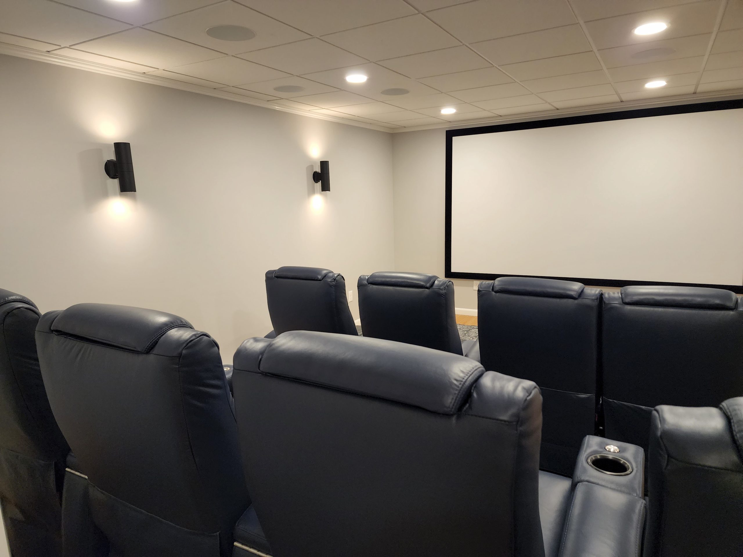 This basement area was finished off with a home theater room and a bathroom to create a fantastic space for movie nights. The addition of a huge projector screen and eight theater chairs combined with light colors and interesting fixtures created a great gathering spot for a large group. All thats left to do is add a few movie posters and a popcorn machine!