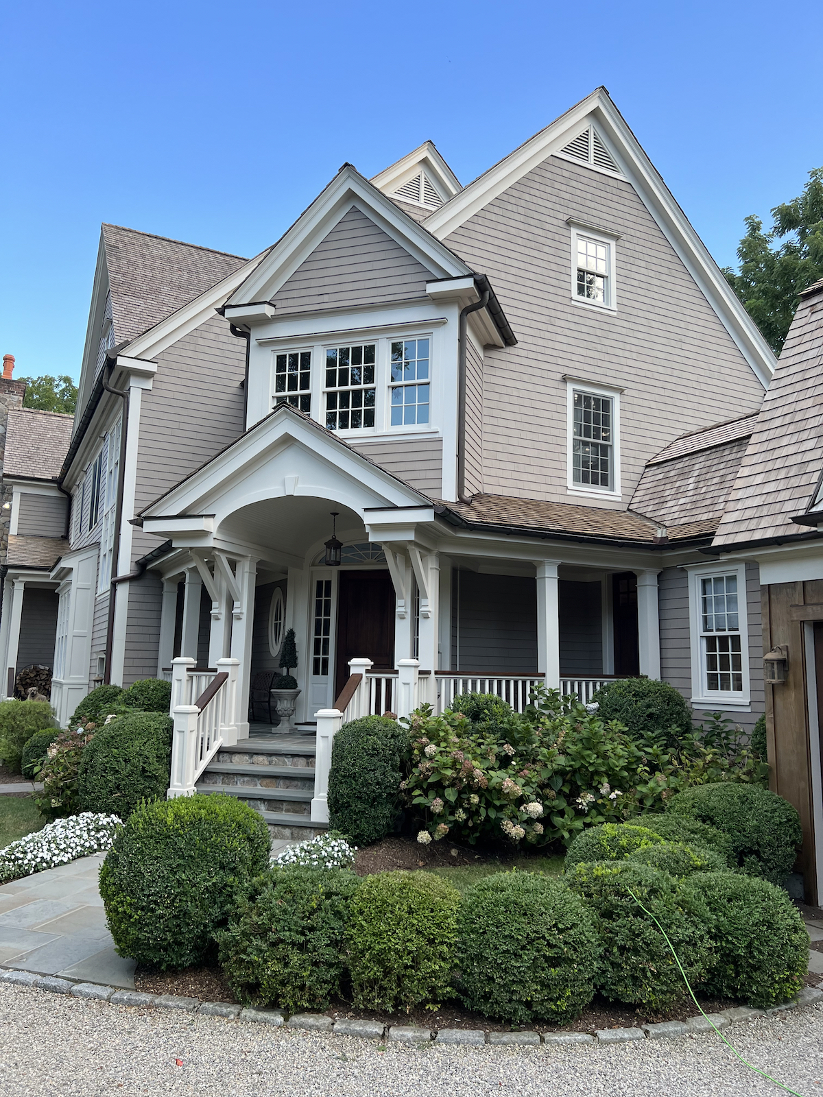 This beautiful home in Westport now boasts a custom-mixed color for the shingle siding that blends nicely with the cedar shingle roof and white trim.