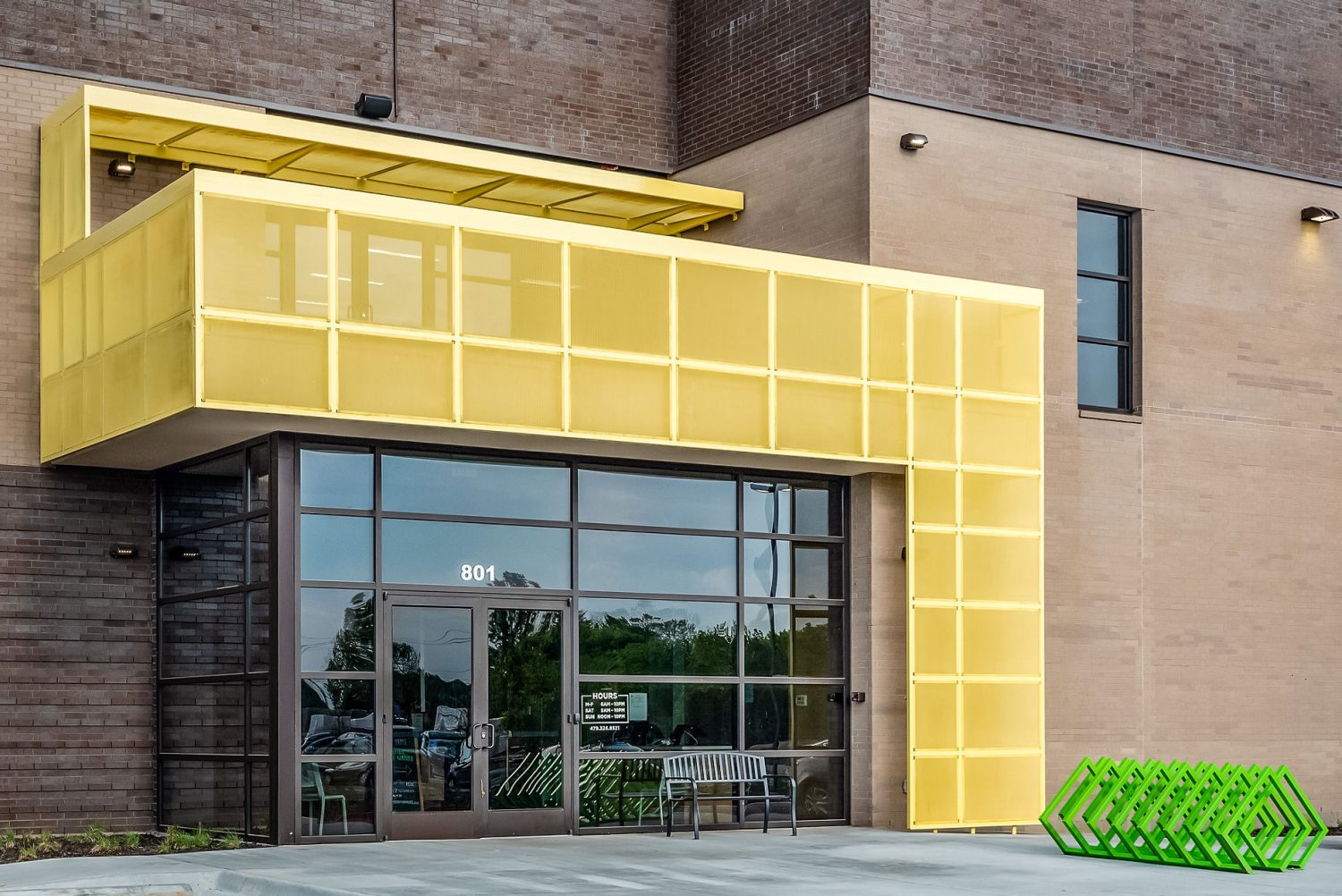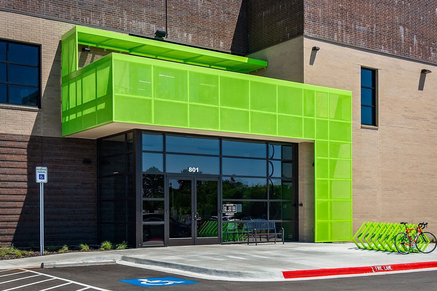 When our customer requests bright green, that is what we give them! Greens and yellows are colors that have very little color retention when exposed to sunlight, adding a bit of difficulty to this project. Leaning on our relationship with Sherwin Williams, we were able to achieve the requested color without compromising quality or color retention with Acrolon 218 High Solids Polyurethane. We coated all metal surfaces, including those suspended just 6 inches from the building. Overspray protection was a high priority on this project, as was working around customers. High traffic areas were performed during nights and weekends to minimize any interruption. If you’re around downtown Bentonville, you can’t miss this one!
