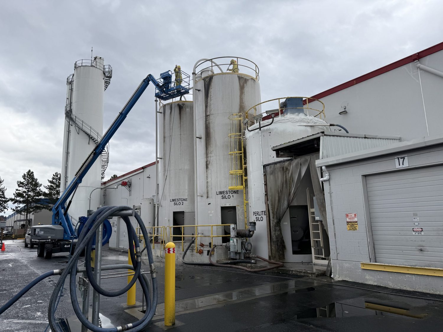 - 65’ Articulating Boom Lift: Used to access high surfaces, including the silos and upper sections of the building.