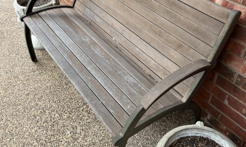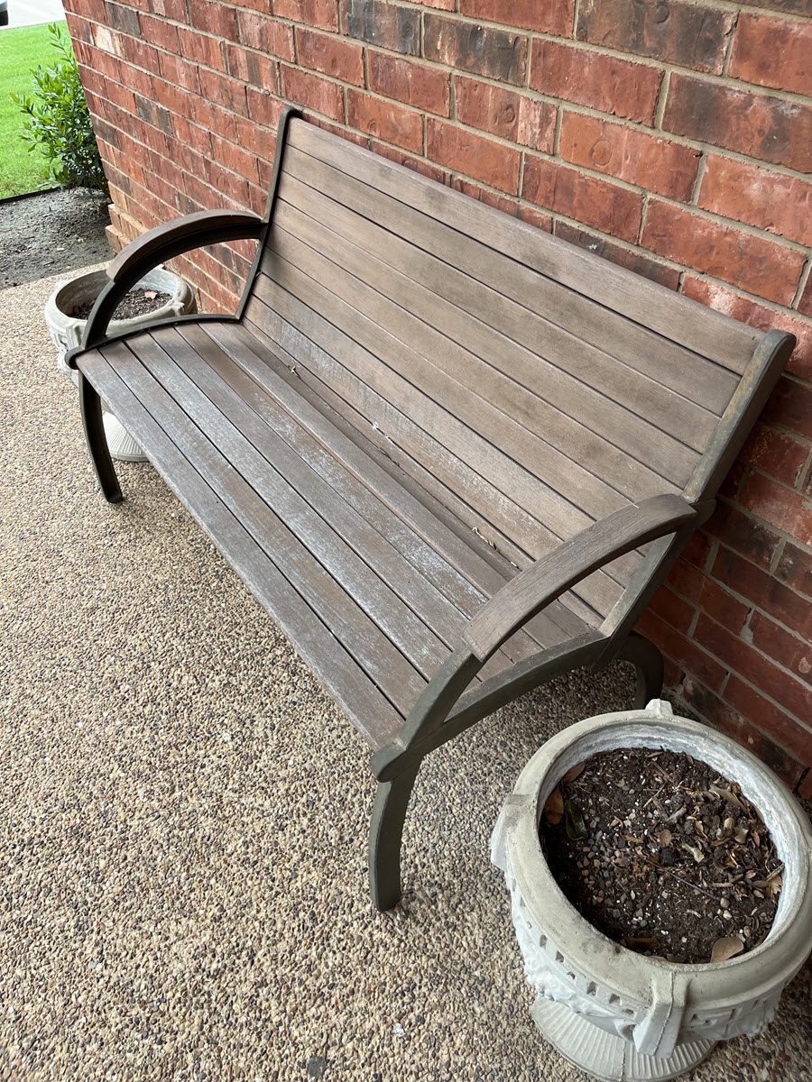 Project: A dental office in Flower Mound, TX, required restoration work on their front door and bench, which had become severely weathered. The property manager, located out-of-state, hired our team to restore these items close to their original condition. Initially, we were tasked with staining the wood. However, due to significant sun damage and graying, we recommended painting the door and bench instead. The property manager agreed, and we proceeded with the project, ensuring to maintain the aesthetic appeal while providing a more durable finish.