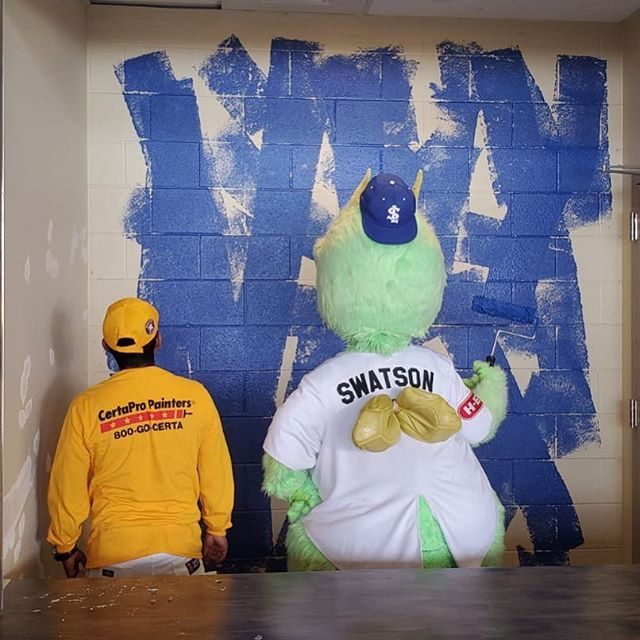 CertaPro Painters® of Central Fort Bend, TX took pictures of the wall painting that took place for the commercial with the team mascot, Swatson. The video shoot brought along a striking color change to the Customer Service Area.