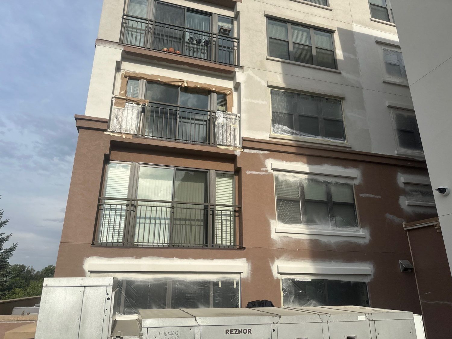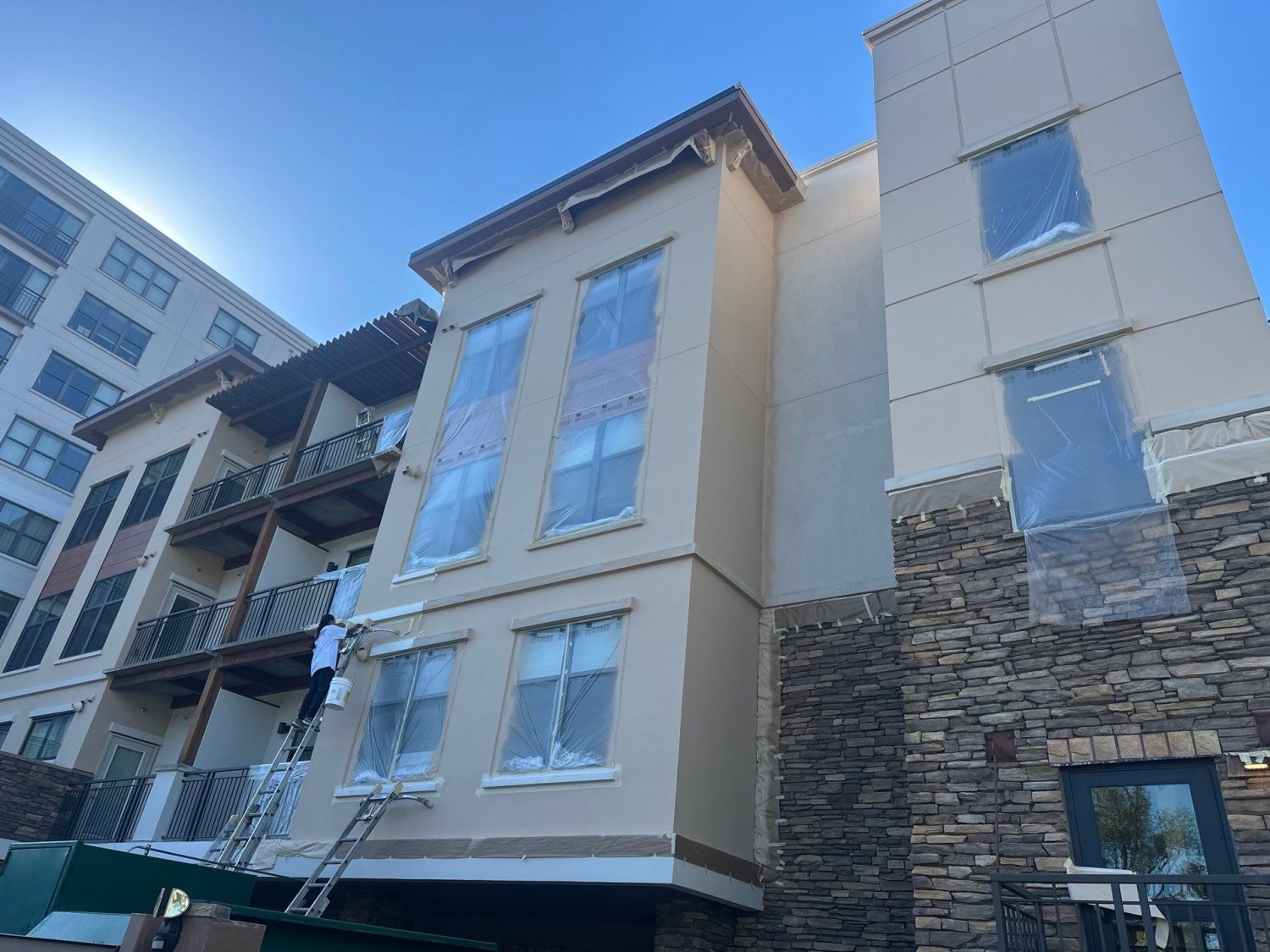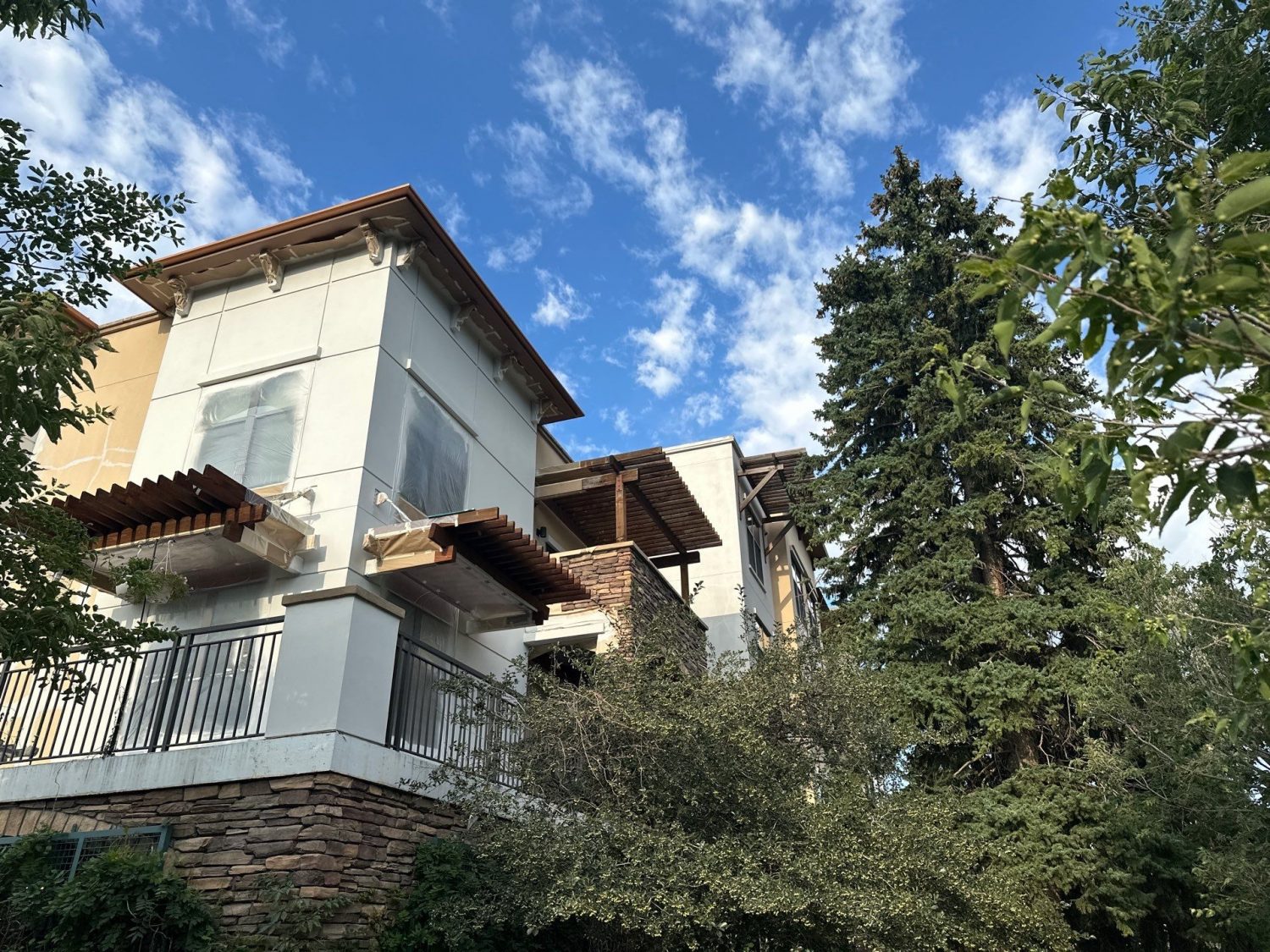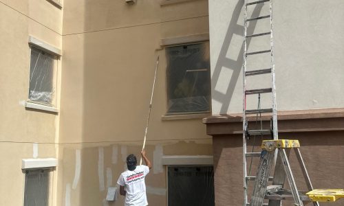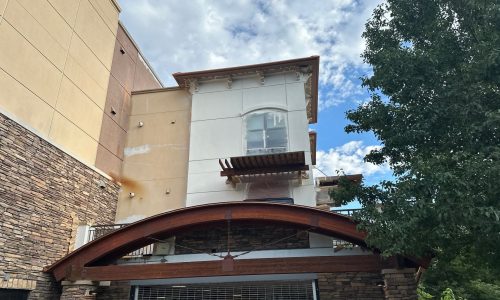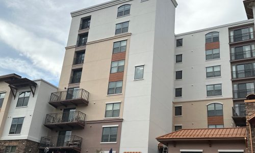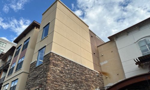 Professional aerial lift equipment was used to safely access upper-story elevations across all sides of the building, supported by OSHA-compliant safety procedures and daily inspections. Specialized exterior painting methods were applied specifically for stucco substrates, including thorough power washing, crack sealing, targeted priming, and multi-coat application systems designed for high-altitude environments.