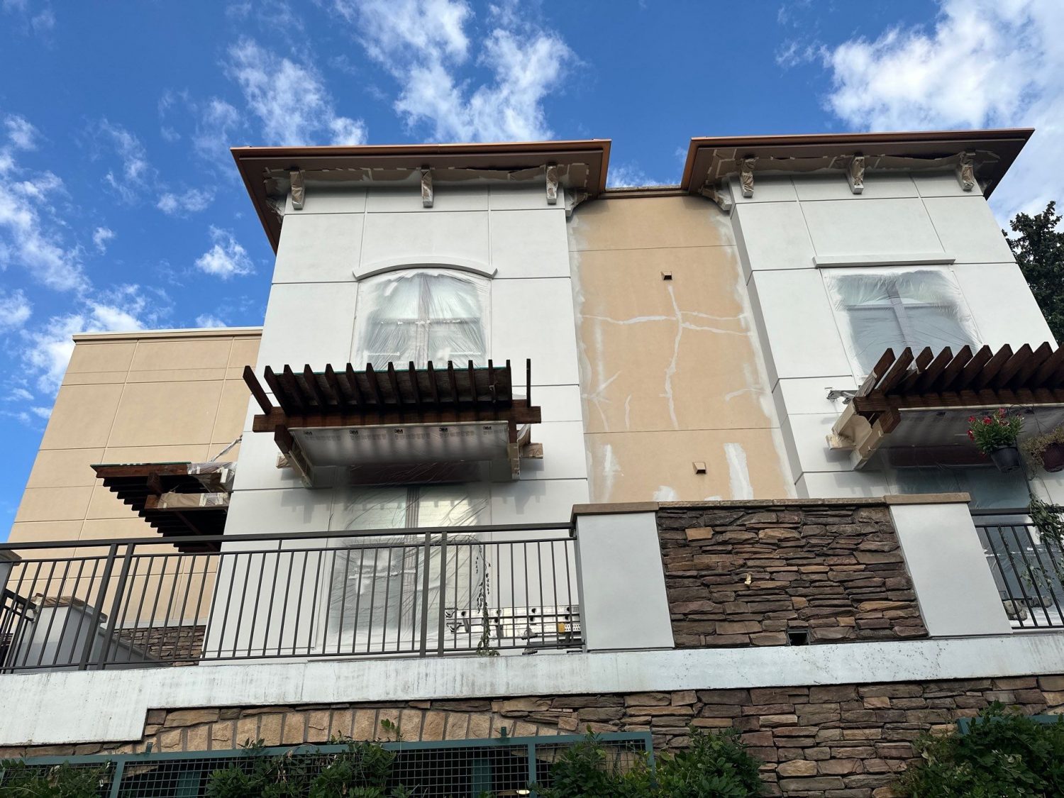 Proper preparation was a critical component of the project and began with comprehensive power washing to remove years of dirt, oxidation, and environmental buildup from stucco surfaces.