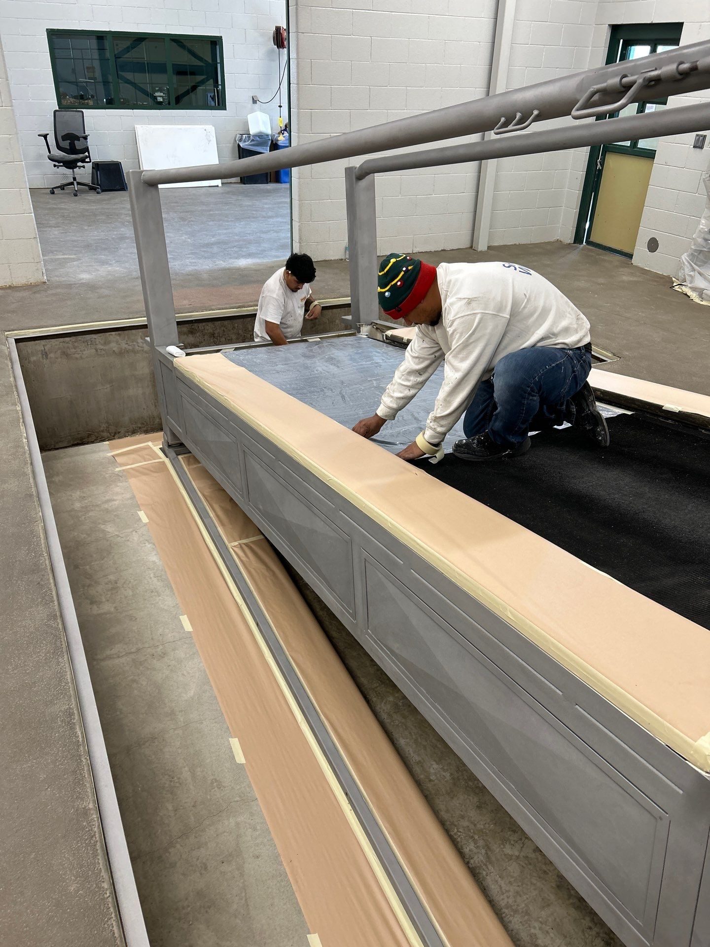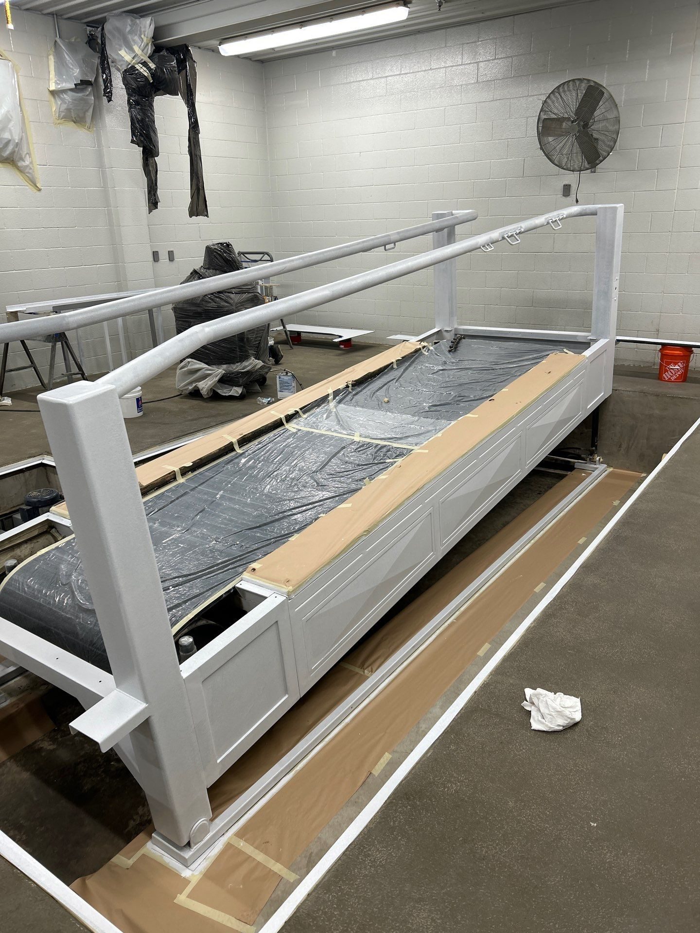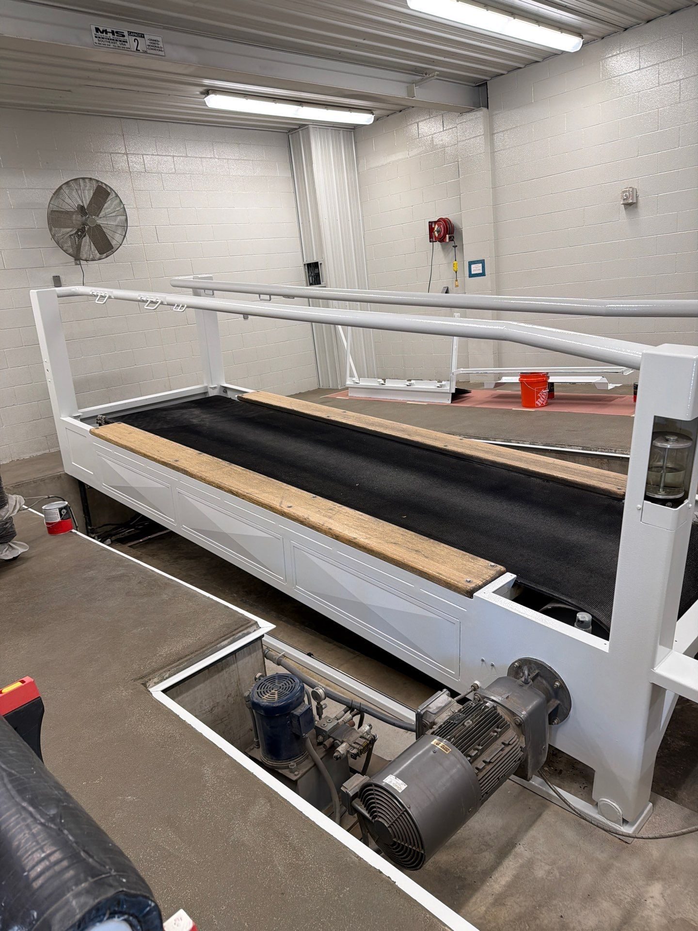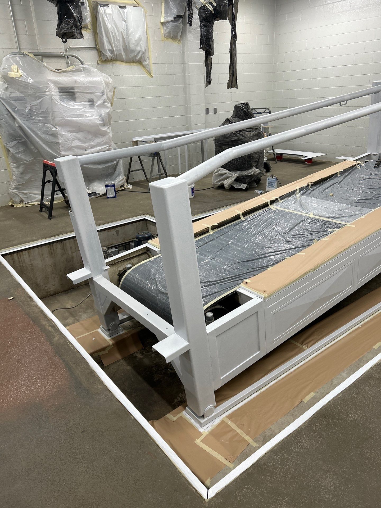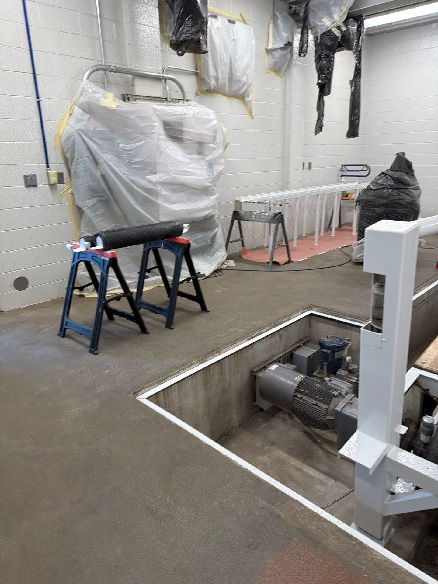 A key focus of the project was protecting the equine treadmill system, which features mechanical components, control panels, and safety systems requiring precise clearances to function properly. Extensive masking and protection were installed around the equipment to prevent overspray or dust intrusion.