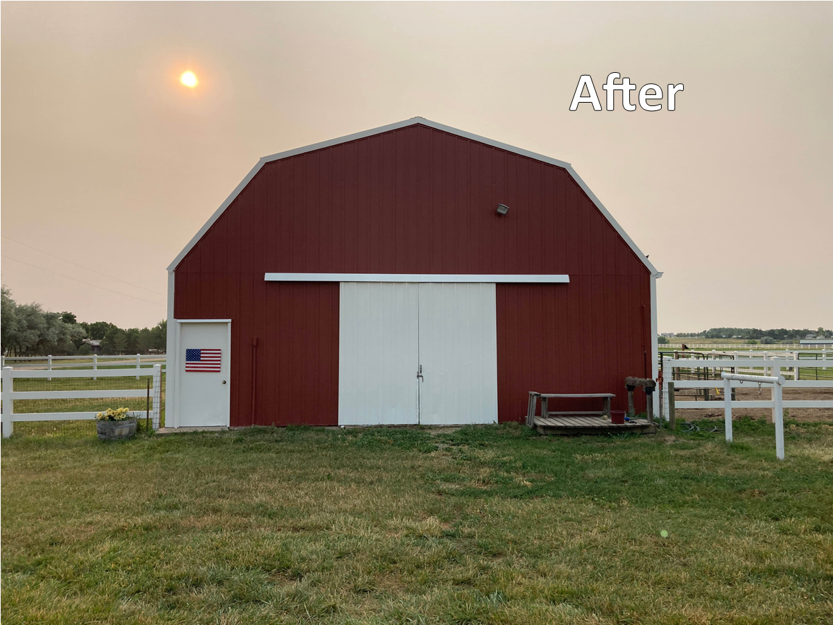 The experts at CertaPro Painters® of Northern Colorado painted the exterior of this barn in Loveland, CO. The project involved painting the siding, trim, doors and metal roof.