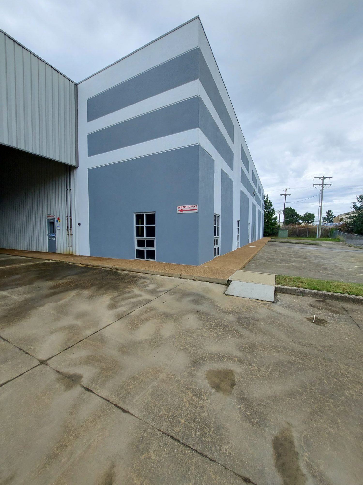 After just 2 weeks of work, the warehouse looks like a different building! The blue shade contrasts perfectly with the gray trim, increasing the curbside appeal by a tremendous amount.