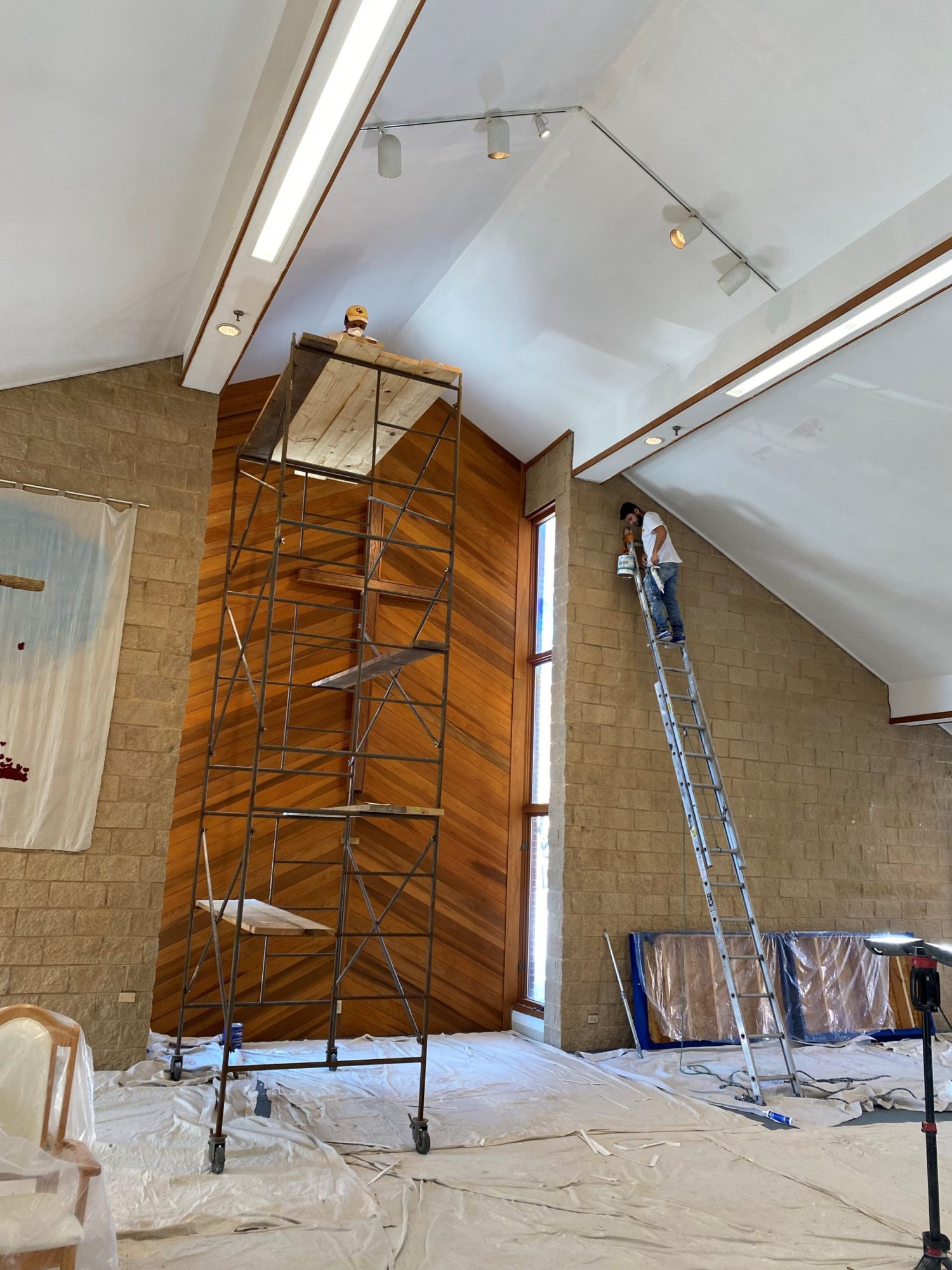 In November of 2023, our team of expert painters was hired by the administration of the Heritage Presbyterian Church to help them repair and refresh the ceiling in the sanctuary as well as paint the ceiling and walls of the narthex and hallway of their church. After a large crack had begun to form in the center of the ceiling, the administration had decided it was time for an update. Overall, the job involved repairing the ceiling, repainting the ceiling, re-staining the wooden accent wall, painting other ceilings and walls, and completing some minor repairs along the way. As the ceiling of the church was very high, our painters utilized scaffolding to complete the job. Throughout the painting process, our team was careful to ensure that the scaffolding did not rest upon any of the church’s decor, and that all of the pews and carpets were protected from paint or other damages.