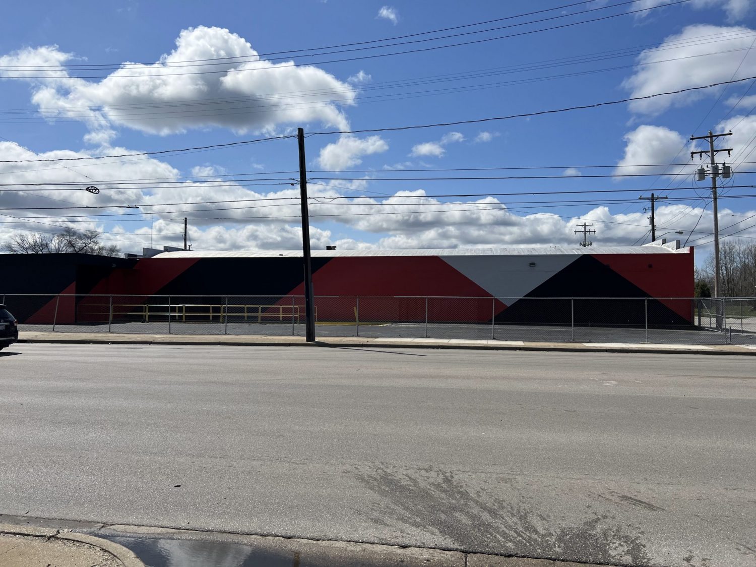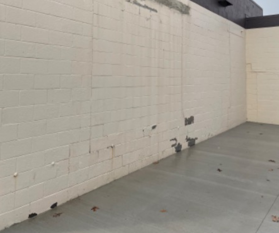 State of the building before the project began: The CMU on the building was in poor condition. Lots of failing paint due to moisture and poor surface prep by painters before us.