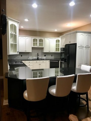 Each cabinet component received oil-based primer and was lightly scuff-sanded between coats for maximum adhesion and durability. The upper and lower cabinets were sprayed with Sherwin-Williams Emerald Urethane Trim Enamel, color-matched to Benjamin Moore OC-127 White Chocolate, while the kitchen island was finished in Black Magic (SW 6991) for a subtle yet dramatic contrast. The result is a bright, refreshed kitchen that combines timeless elegance with long-lasting durability, delighting the homeowners.