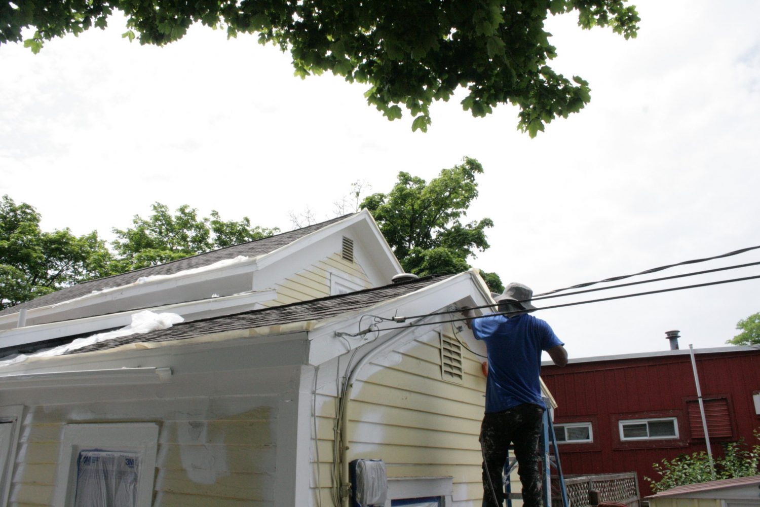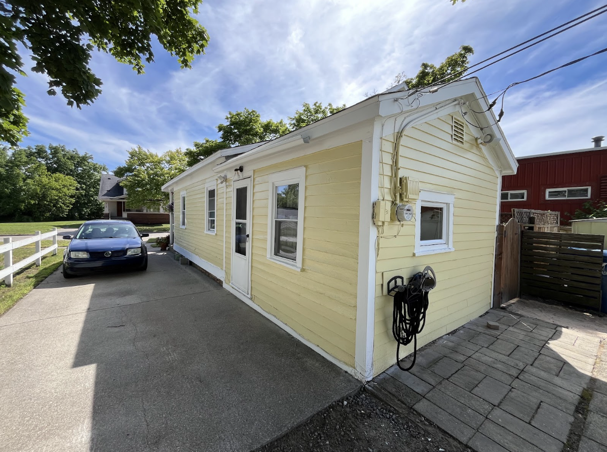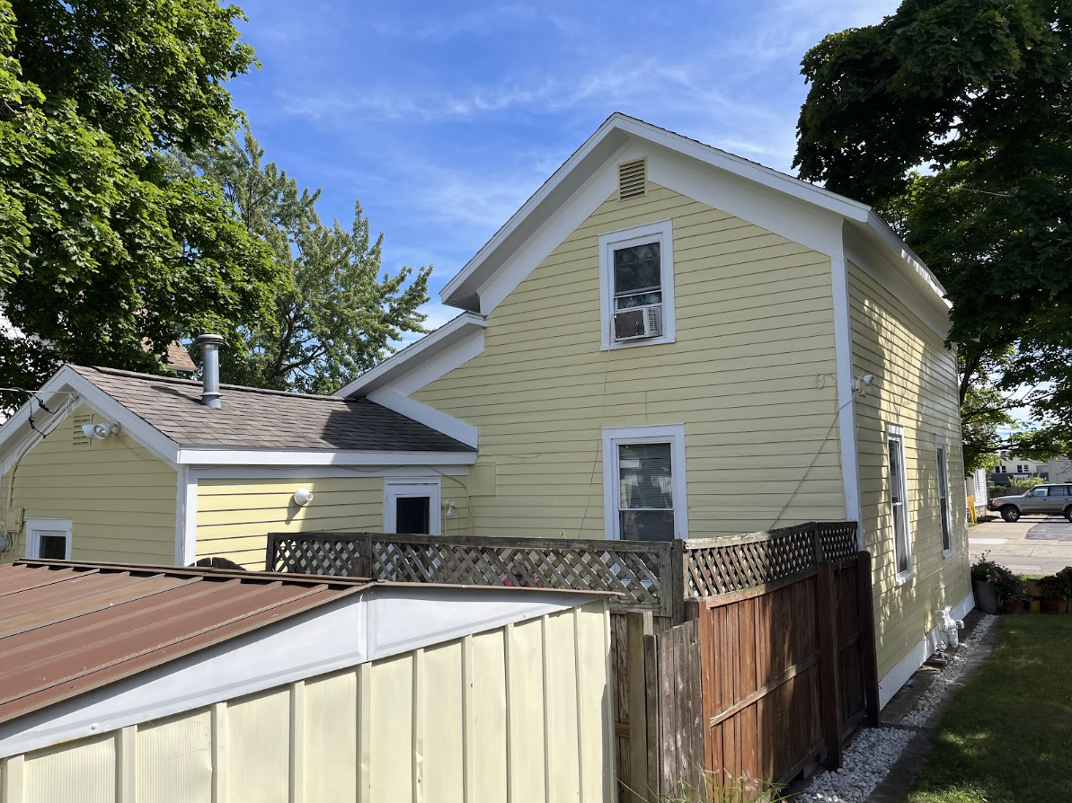 CertaPro Painters® of Grand Haven completed this residential exterior painting project in Grand Haven in 2024. The home was fully power washed, all peeling paint was scraped, and two coats of Sherwin-Williams Latitude were applied to the siding and trim in a two-tone finish. The exterior walls were painted yellow, while the window frames, fascia, and trim were finished in white, with a custom horizontal stripe added midway around the tower for a distinctive accent.