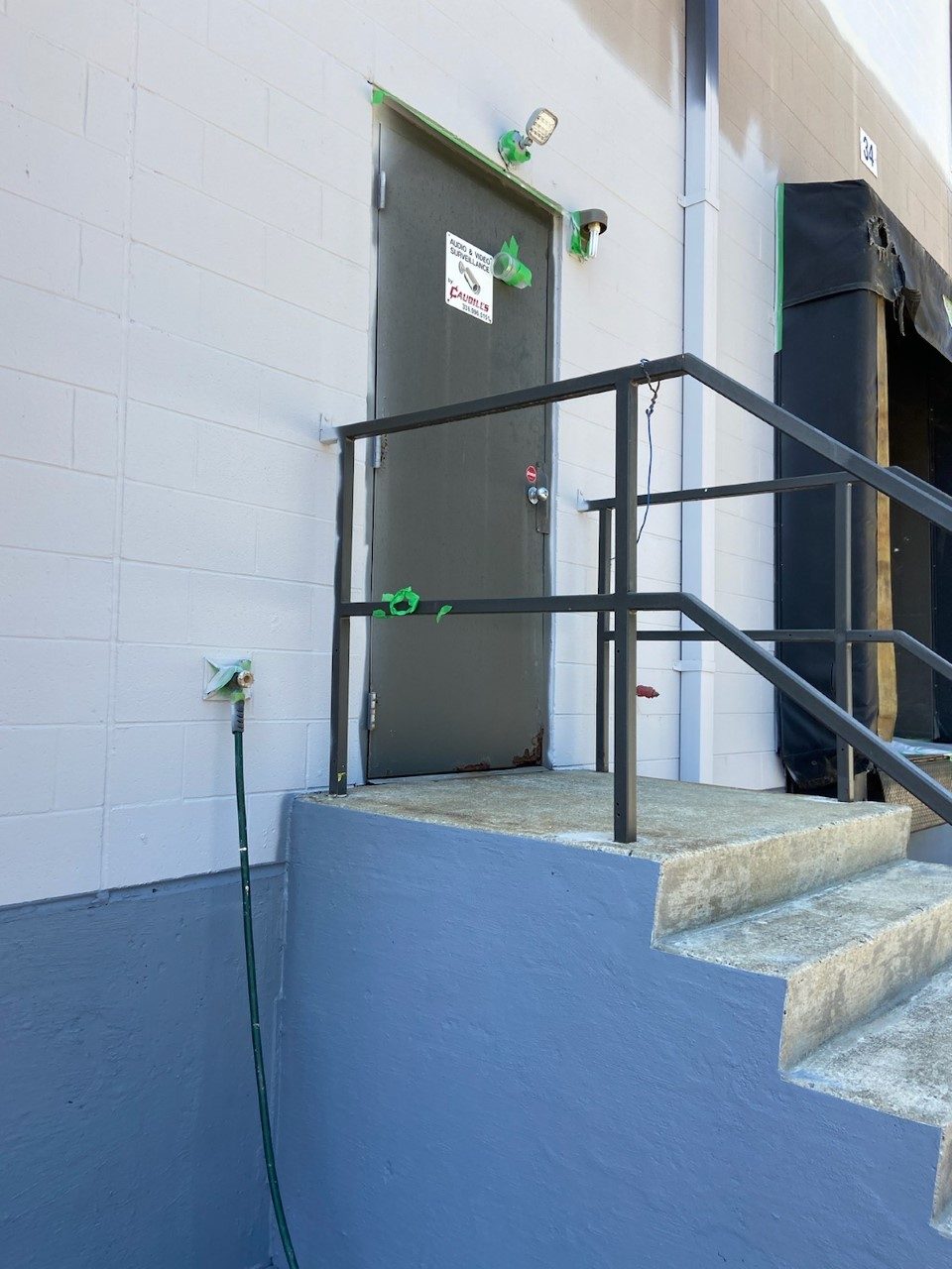 To begin with, a full pressure wash of the entire building was required, not only for the dirt, but to remove loose paint as well. Following the pressure wash, the crew prepped and spot-primed rusted areas on railings and metal stairs. The team then fully primed unpainted concrete, and finished with the final coats on all painted surfaces including building walls, adjoining retaining walls, roll up doors and frames, and railings and ladders.