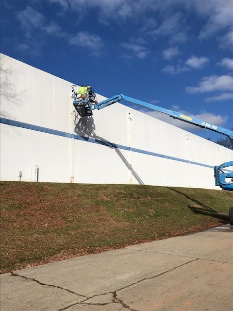 Our team was asked to repaint the exterior of a group of three tilt-up buildings on Industrial Village Road. Tilt-up is a type of construction where concrete is cured in a horizontal position then “tilted” into a vertical position. The customer is one of the largest property management groups in the country.