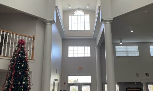 One of the main challenges was coordinating with the facility’s schedule, particularly around the activities in the common room and a holiday party. To minimize disruption, we worked around these events and even completed some of the work during evening hours. Additionally, an atrium lift was used to reach the higher areas that needed attention. As requested, the team applied the paint using brushes and rollers, avoiding spray techniques.