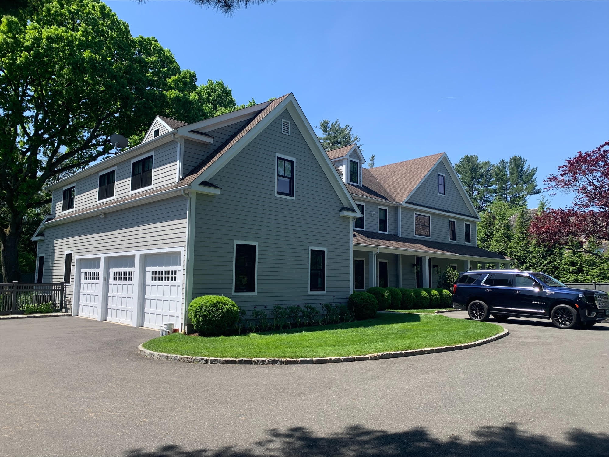 BODY: Benjamin Moore-MoorGard Low Lustre Cape May CobbleStone- customers request.TRIM: Benjamin Moore-MoorGlo Low Lustre-Kendall Charcoal.White Accent: Benjamin Moore-MoorGard Low Lustre-Super White