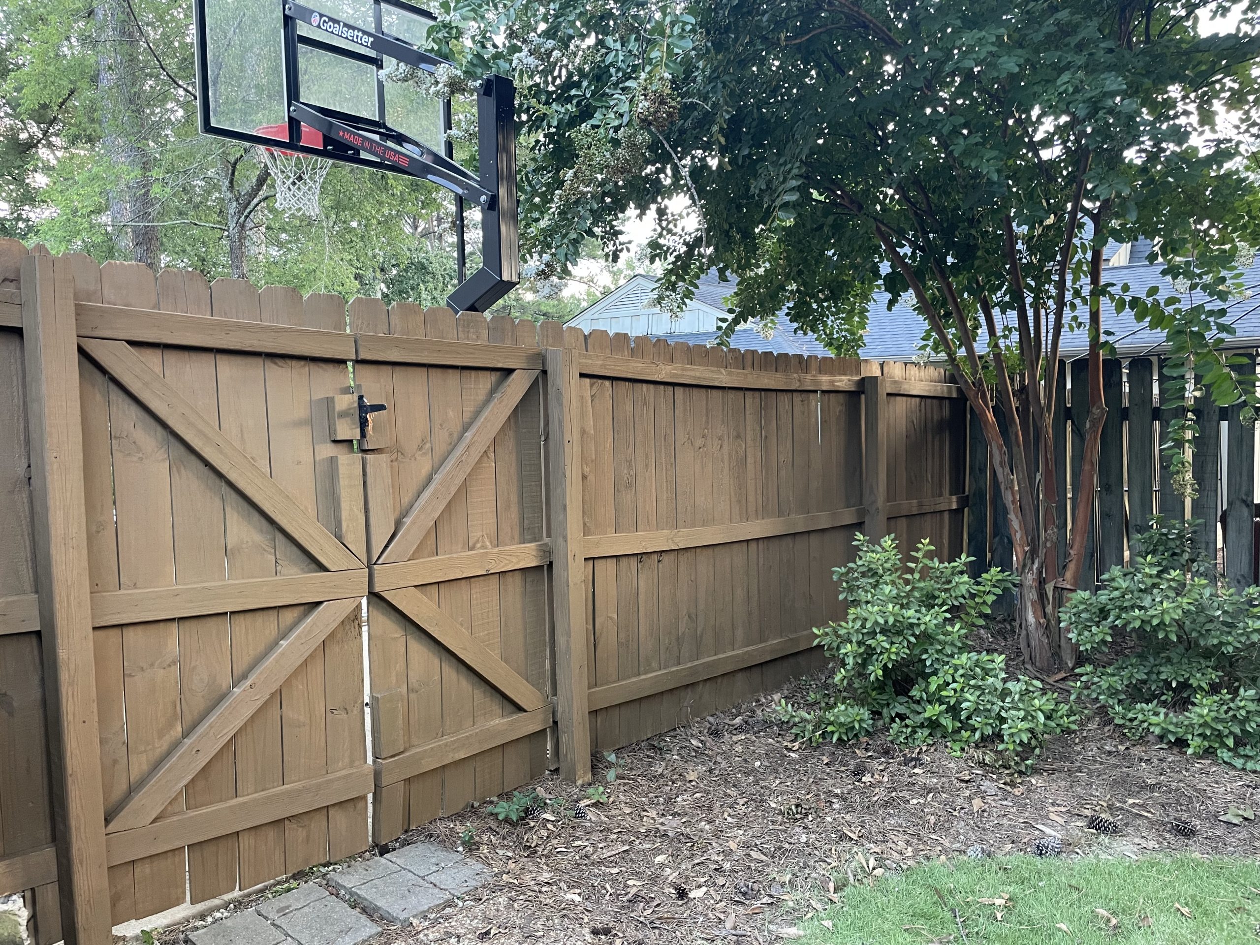 The team at CertaPro Painters of Greystone stained this wood privacy fence in Vestavia Hills in July 2024 with Farrell Calhoun “Light Walnut” semi-transparent stain.