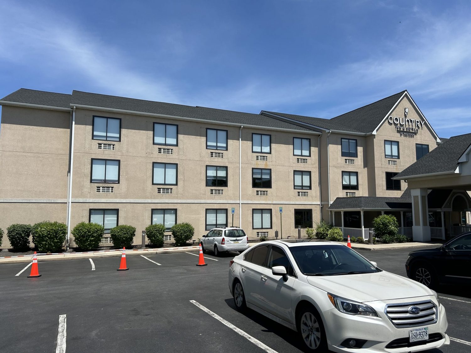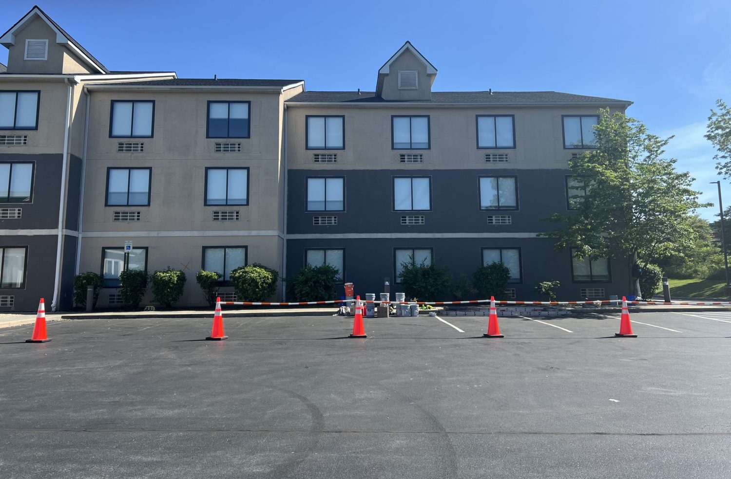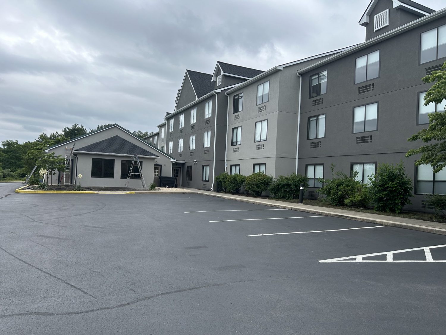 The client came to us in May 2024 looking to have the hotel’s exterior repaired & repainted. The exterior was dated with faded color and their were significant hairline fractures and holes throughout. The project would have to be completed around the hotels operating hours with constant customer foot traffic. The metal roof of the pool house was also to be painted during the hot days of May where products may not stay if applied to the roof in the heat.