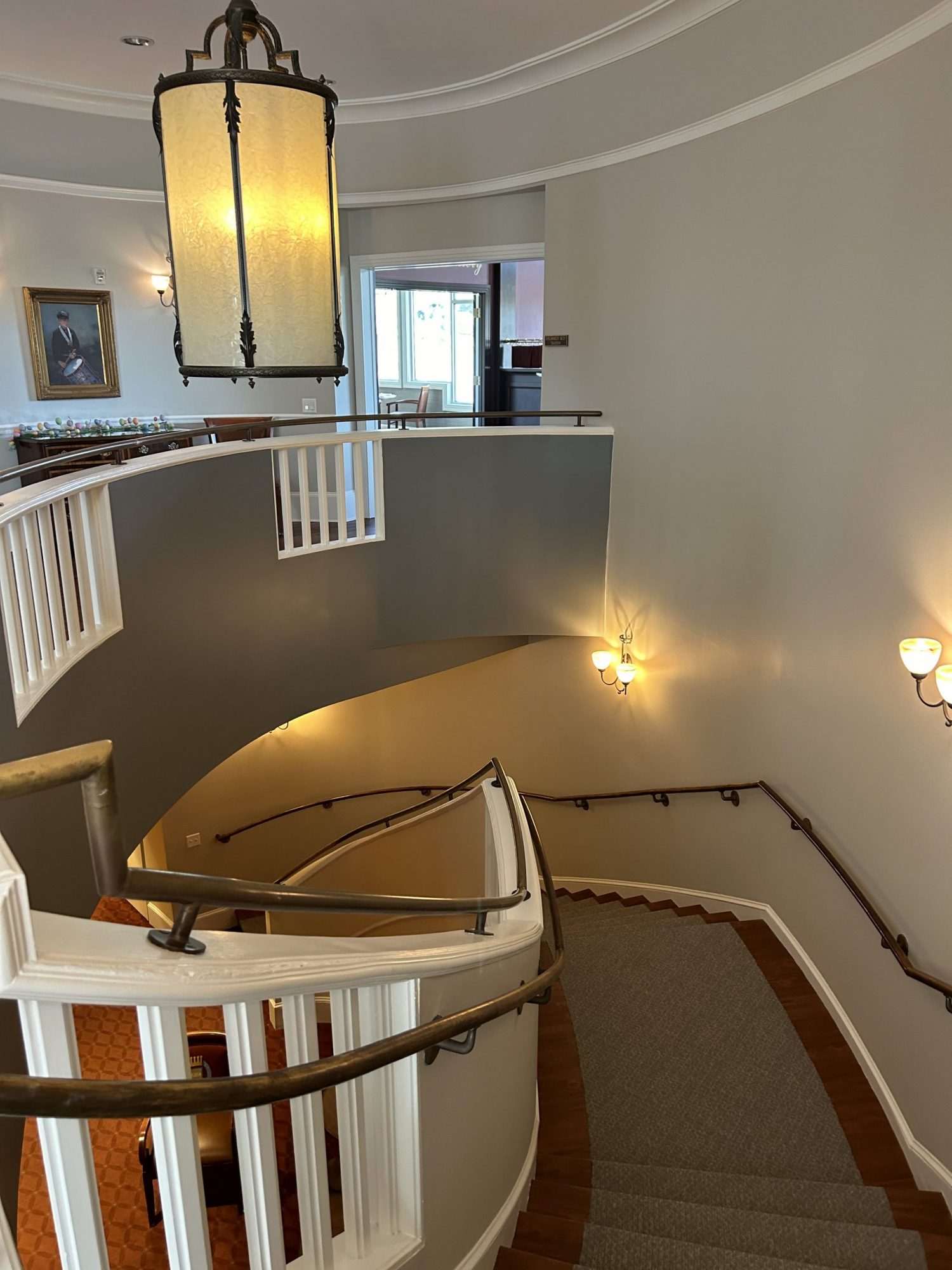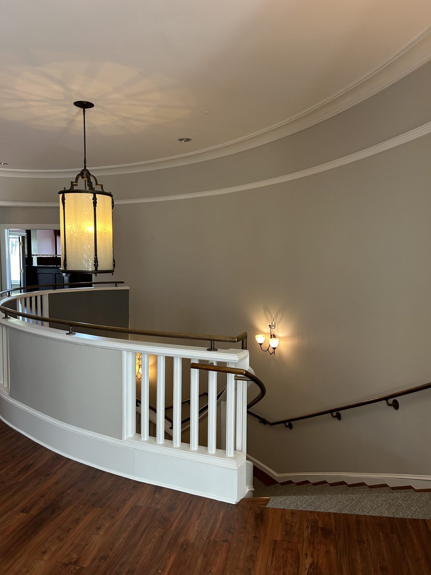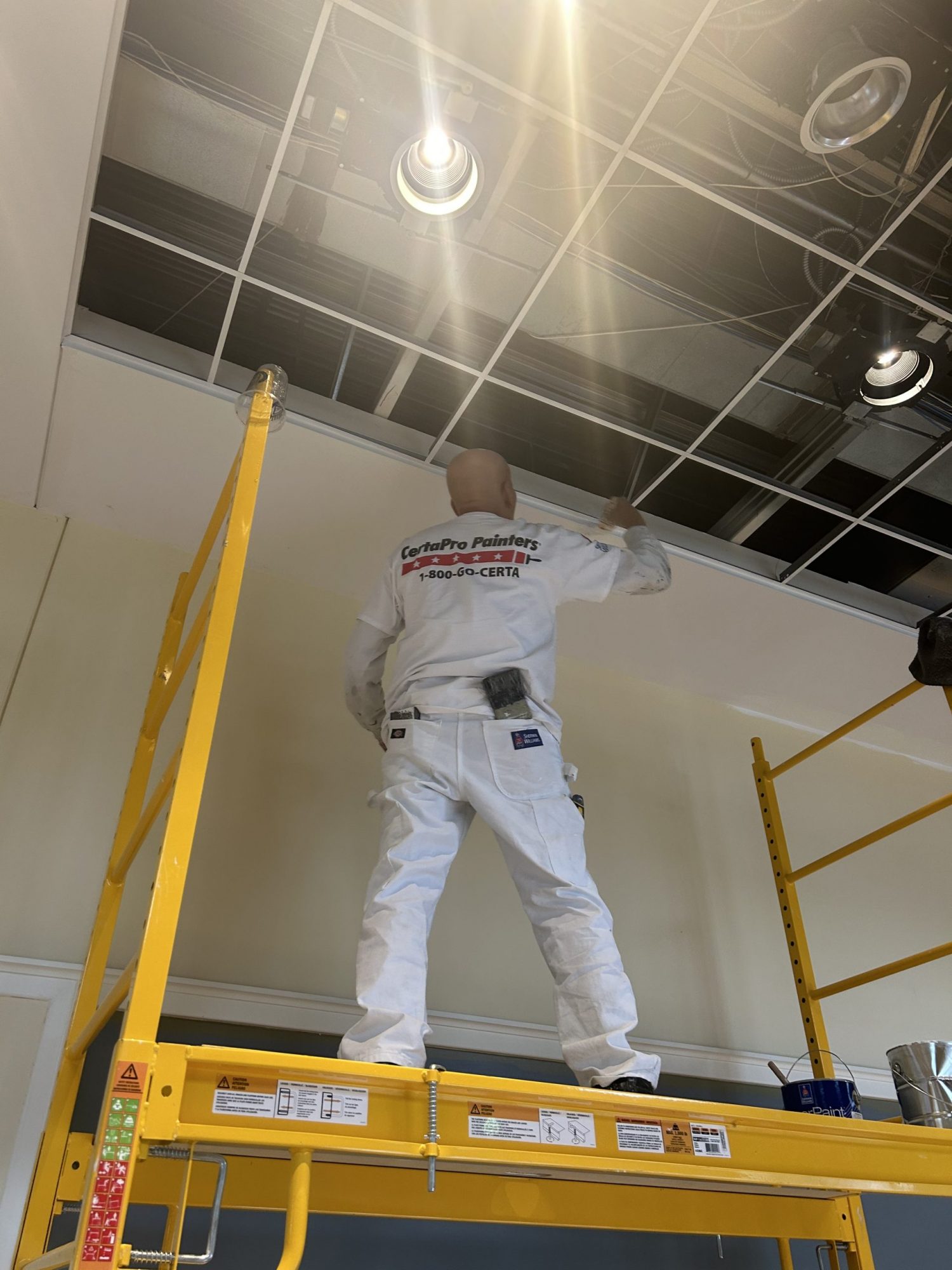 We coordinated with an independent contractor who removed the drop ceiling panels for painting, to ensure painting efforts were not delayed. Scaffolding was used to reach and paint the higher ceilings. This included removing a brass railing at the top of the stairwell to set up the scaffolding.