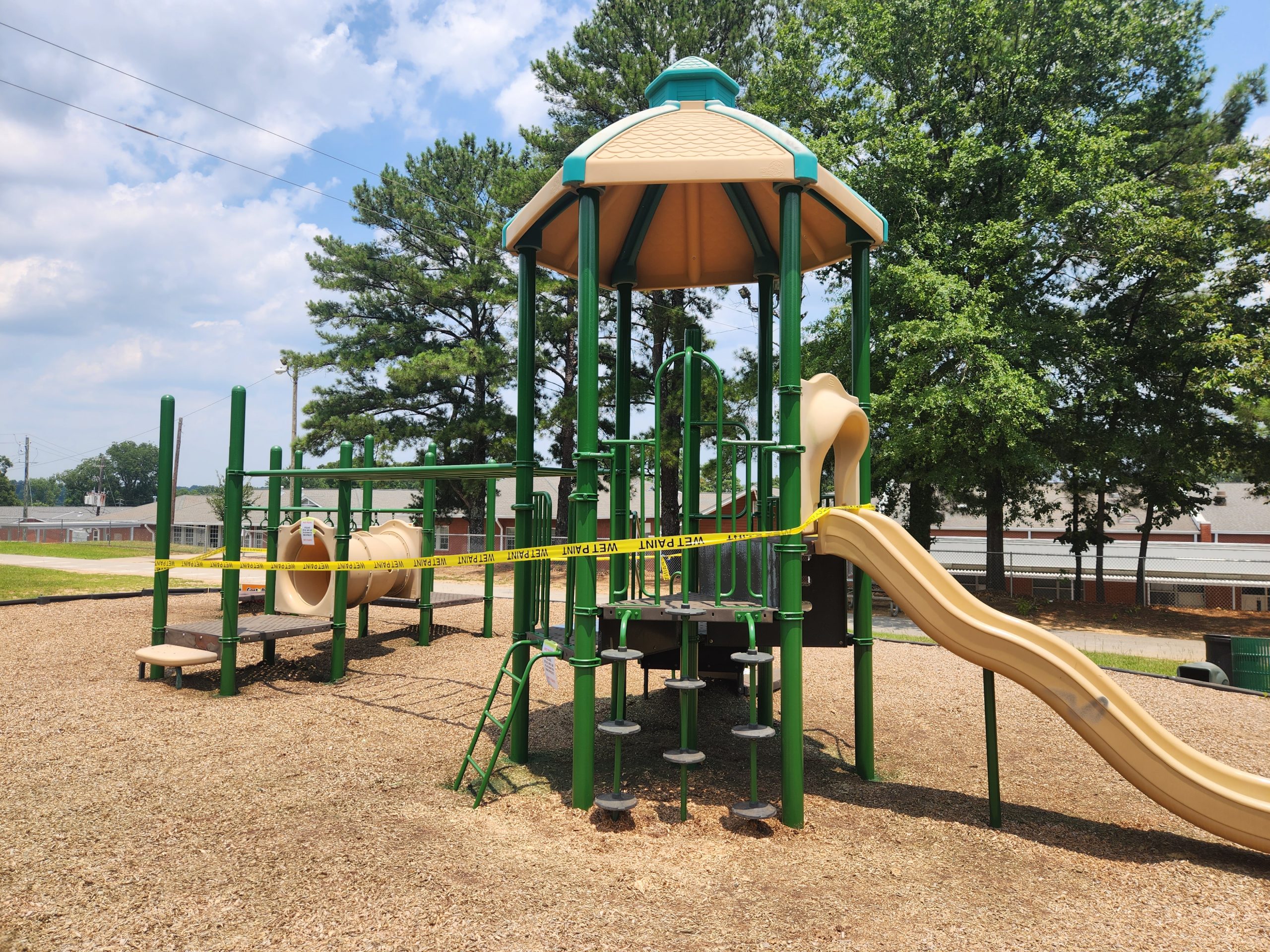 Working in conjunction with Alabama Soda Blast we used media blasting to remove the old coating down to ‘white metal’, Primed and repainted several pieces of playground equipment. Click through to see additional images as we worked through this project.