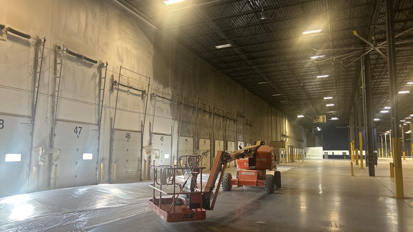 The crew coordinated equipment placement throughout the facility to safely reach elevated areas while maintaining productivity and efficiency across the large interior footprint.