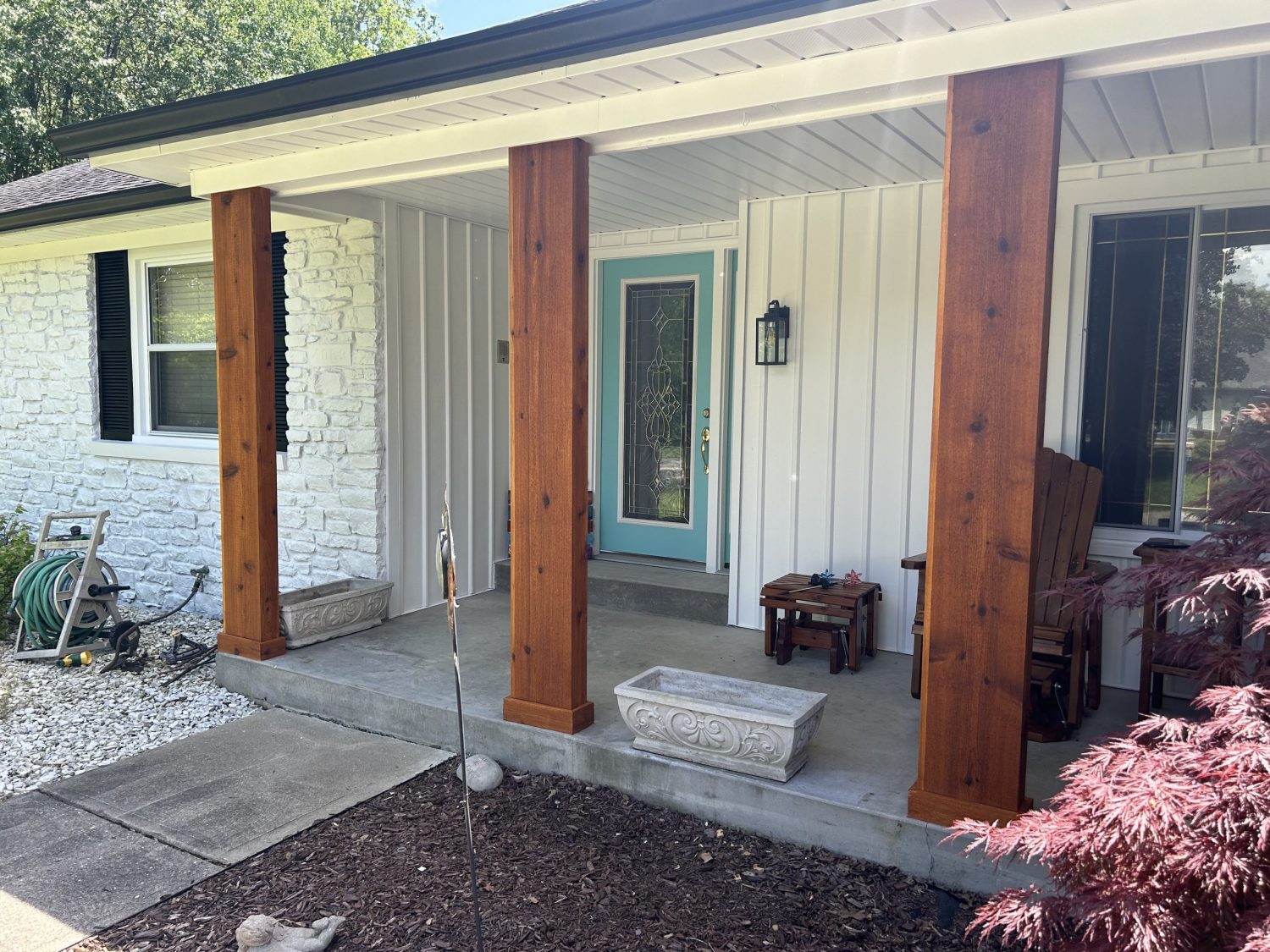 The existing porch posts were tired-looking and required frequent maintenance. The customer was looking for a modern upgrade and decided to go with faux wooden posts that would provide a natural wood appearance without the hassle of regular upkeep.