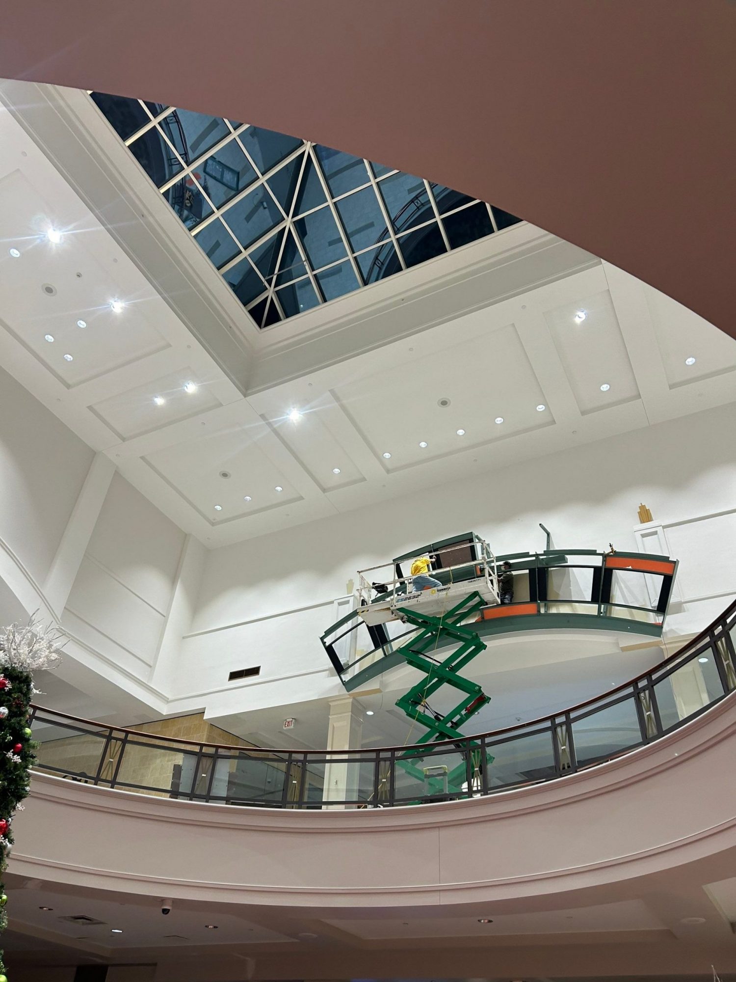 Execution required the use of scissor lifts, boom lifts, and atrium man lifts in multiple locations. Navigating large equipment within an active shopping mall environment demanded a high level of precision, planning, and adherence to strict safety protocols.