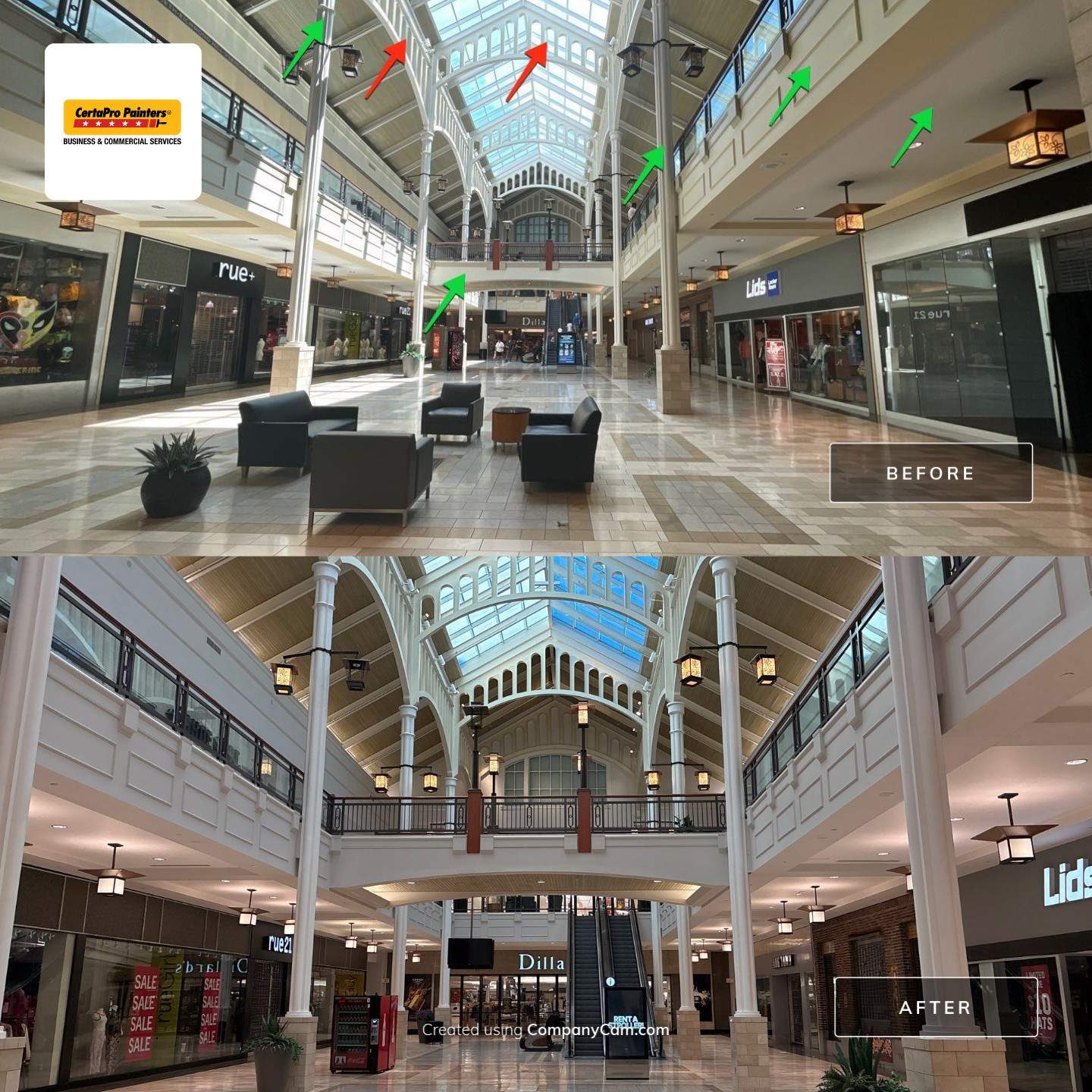 The project included painting of interior common area walls, ceilings, railings, service doors, and facia around elevator/clock tower. It also included removal/demo of “old” common area signage, wall paper removal/drywall refinishing, and installation of new acrylic panels in interior mall lighting fixtures.