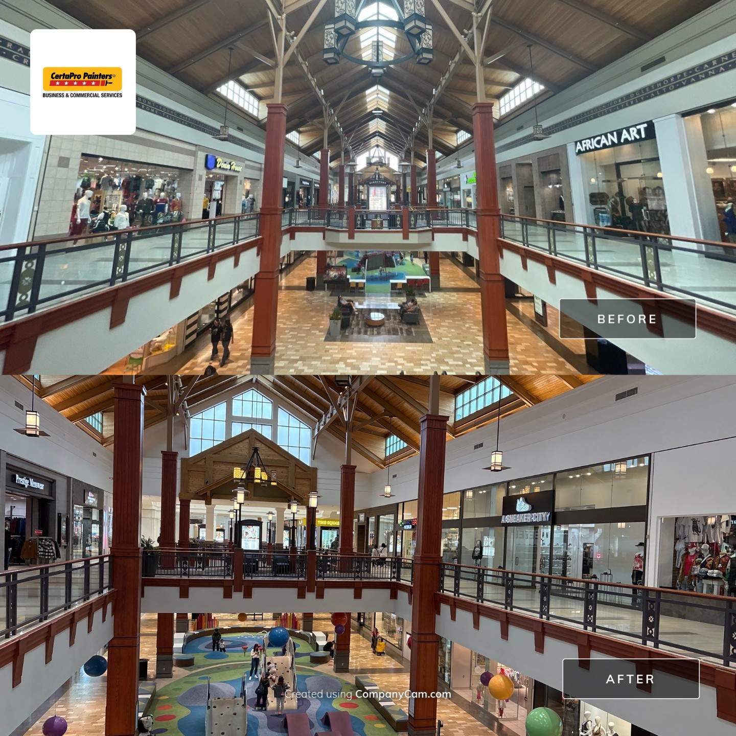 In October 2024, CertaPro Painters® of Indianapolis completed an interior renovation project at a high-traffic shopping mall in Buford, Georgia that offers more than 220 stores/services – the largest shopping mall in the state of Georgia. The project centered on comprehensive interior revitalizations, specifically focusing on wallpaper removal and installation, drywall refinishing and repair, and “de-theming” spaces through signage removal and painting, as well as the installation of new, brighter acrylic panels for interior light fixtures.
