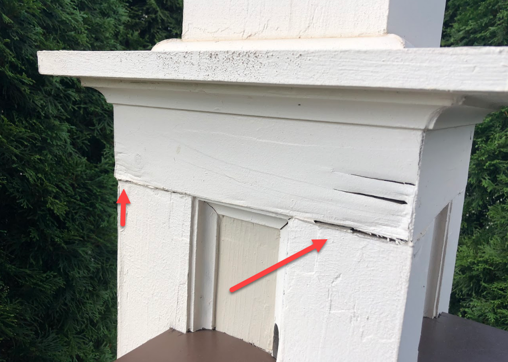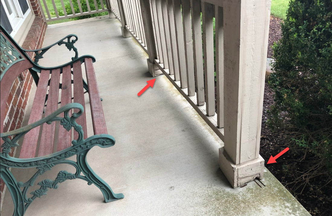 Porch column base caps you will commonly find rotten. Many builders in the Indianapolis area will install trim at the base of a porch post or column. Because these board often touch the porch flooring they will be exposed to standing water which causes the rot.