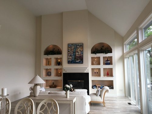 Interior: Your furniture and décor are placed in the center of the room, covered with new plastic, and all flooring is protected with drop cloths.