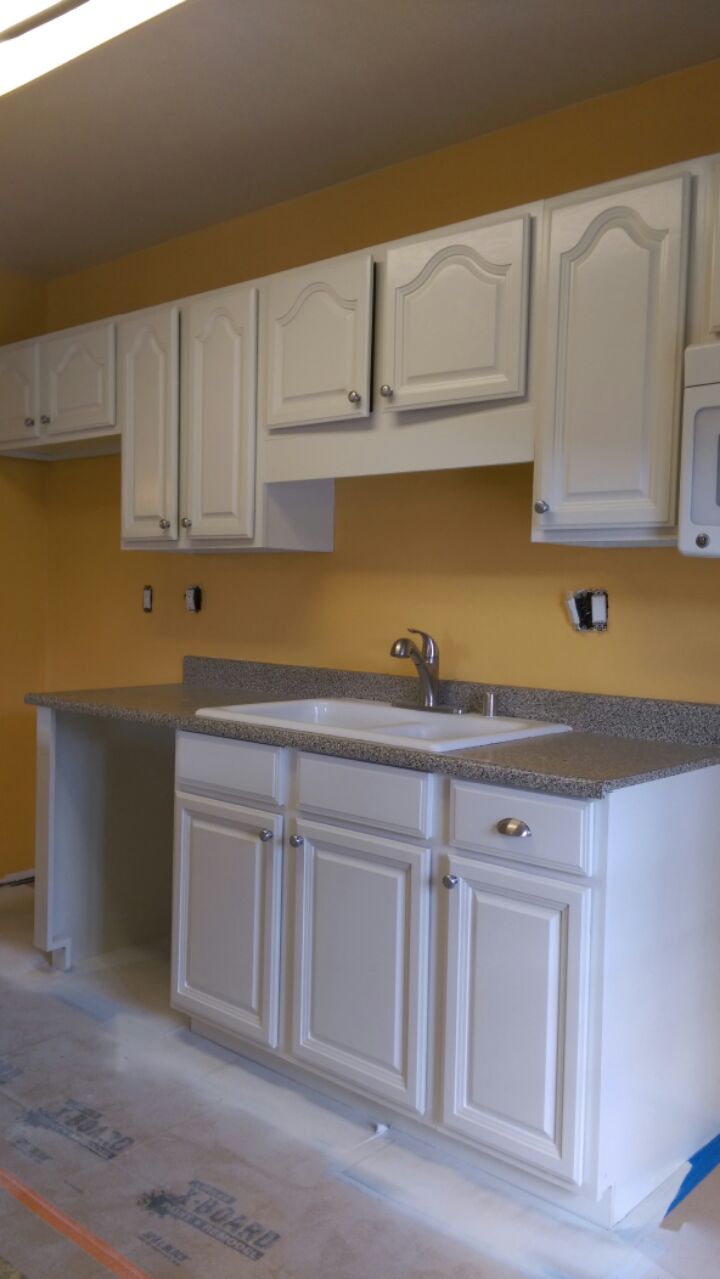 Of course, here is the sink area. As you can see, we take very good care of the floors when we paint kitchen cabinets. Everything we don’t want to be painted is covered.