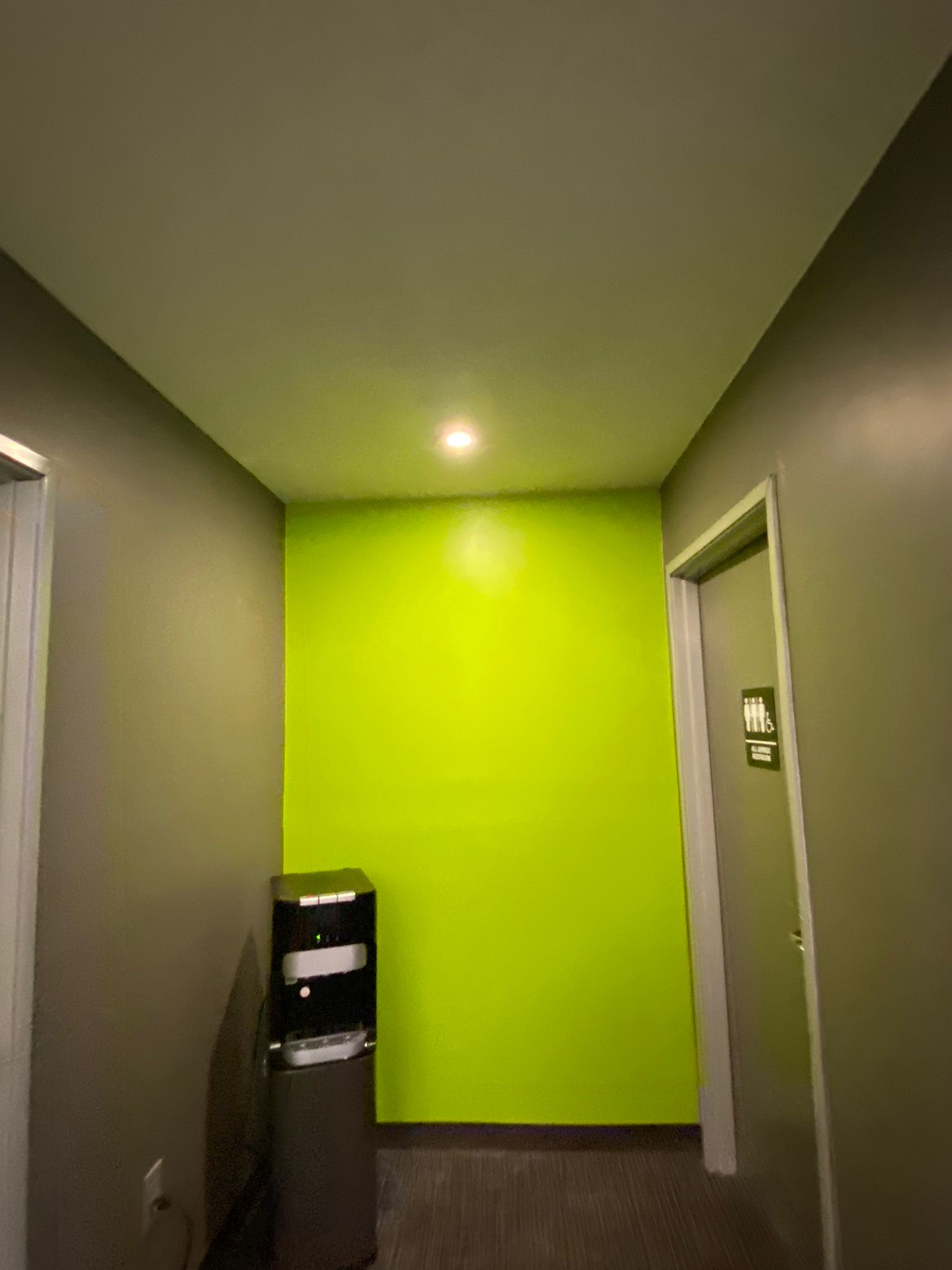 This small hallway with a unique accent wall need to have its color matched and repainted to hide scuffs. It also required a drywall patch repair in the ceiling followed by a ceiling painting as well.