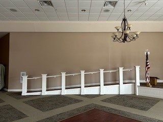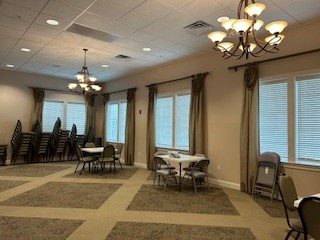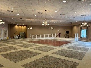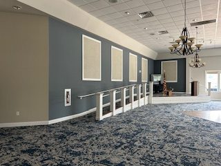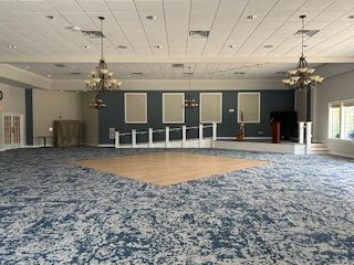 CertaPro Painters of Lancaster renovated a large ballroom at Alden Place Homeowners Association, a 55+ community in Lebanon, PA. The room was outdated, with worn carpets and scuffed walls. We repainted the walls, doors, windows, and trim using high-gloss finishes as directed by the corporate designer. We also worked with a local lumber yard to create and install five custom wooden trim boxes with wallpaper panels on the main stage wall. The project followed the designer’s plan and resulted in a fresh, modern ballroom for the community.