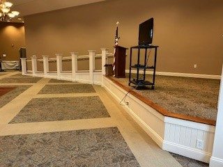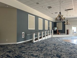 CertaPro Painters of Lancaster renovated a large ballroom at Alden Place Homeowners Association, a 55+ community in Lebanon, PA. The room was outdated, with worn carpets and scuffed walls. We repainted the walls, doors, windows, and trim using high-gloss finishes as directed by the corporate designer. We also worked with a local lumber yard to create and install five custom wooden trim boxes with wallpaper panels on the main stage wall. The project followed the designer’s plan and resulted in a fresh, modern ballroom for the community.